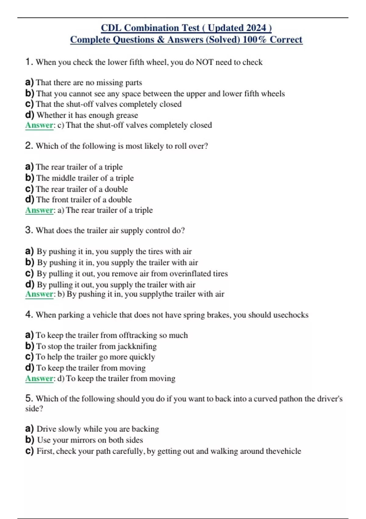 CDL Combination Test ( Updated 2024 ) Complete Questions & Answers (Solved) 100% Correct 1. When you check the lower fifth wheel, you do NOT need to check a) That there are no missing parts b) That you cannot see any space between the upper and lower fifth wheels c) That the shut-off valves completely closed d) Whether it has enough grease Answer: c) That the shut-off valves completely closed 2. Which of the following is most likely to roll over? a) The rear trailer of a triple b) The middle trailer of a triple c) The rear trailer of a double d) The front trailer of a double Answer: a) The rear trailer of a triple 3. What does the trailer air supply control do? a) By pushing it in, you supply the tires with air b) By pushing it in, you supply the trailer with air c) By pulling it out, you remove air from overinflated tires d) By pulling it out, you supply the trailer with air Answer: b) By pushing it in, you supplythe trailer with air 4. When parking a vehicle that does not have spring brakes, you should usechocks a) To keep the trailer from offtracking so much b) To stop the trailer from jackknifing c) To help the trailer go more quickly d) To keep the trailer from moving Answer: d) To keep the trailer from moving 5. Which of the following should you do if you want to back into a curved pathon the driver's side? a) Drive slowly while you are backing b) Use your mirrors on both sides c) First, check your path carefully, by getting out and walking around thevehicle d) Do all of the above Answer: d) Do all of the above