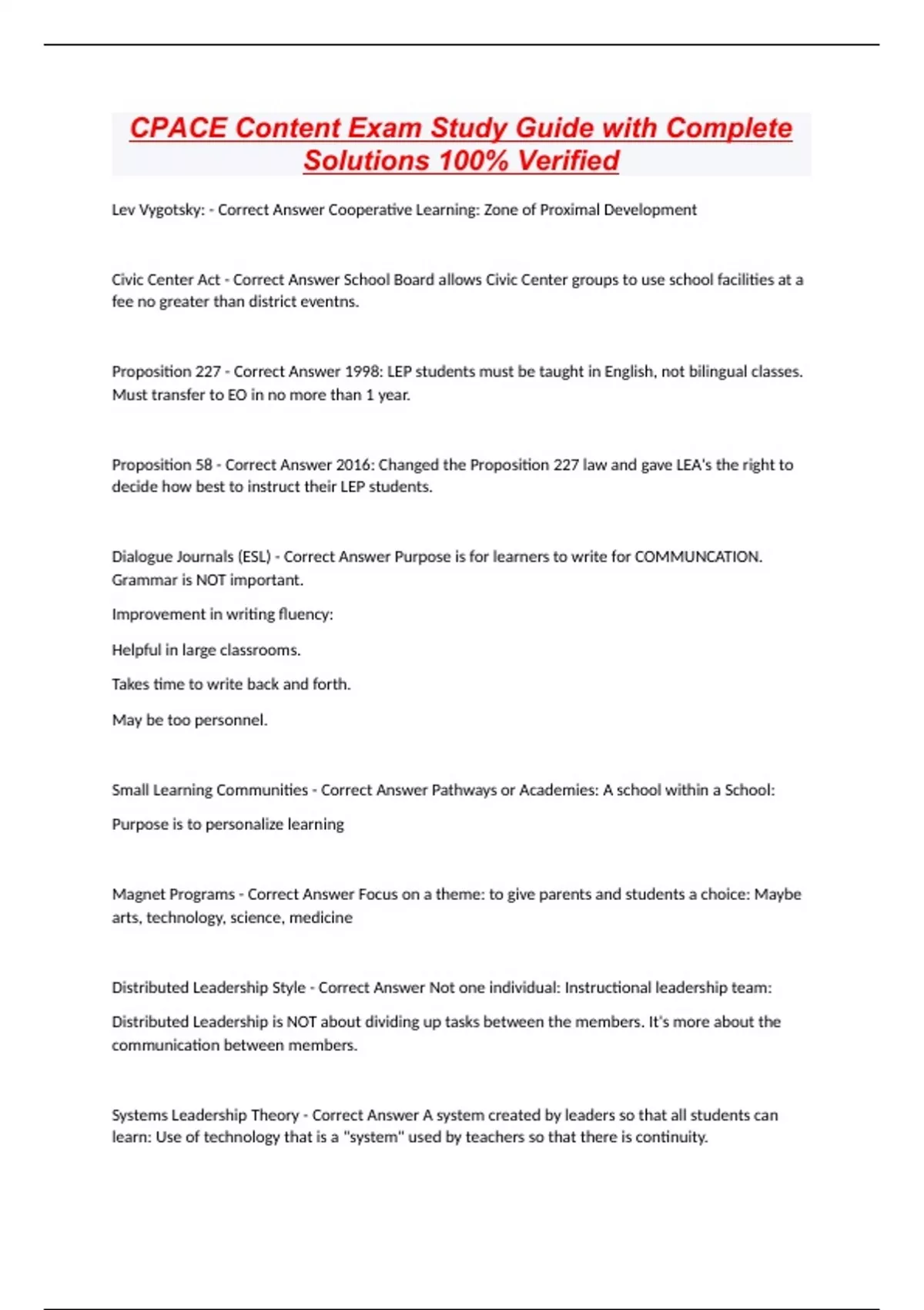 Lev Vygotsky: - Correct Answer Cooperative Learning: Zone of Proximal Development Civic Center Act - Correct Answer School Board allows Civic Center groups to use school facilities at a fee no greater than district eventns. Proposition 227 - Correct Answer 1998: LEP students must be taught in English, not bilingual classes. Must transfer to EO in no more than 1 year. Proposition 58 - Correct Answer 2016: Changed the Proposition 227 law and gave LEA's the right to decide how best to instruct their LEP students. Dialogue Journals (ESL) - Correct Answer Purpose is for learners to write for COMMUNCATION. Grammar is NOT important. Improvement in writing fluency: Helpful in large classrooms. Takes time to write back and forth. May be too personnel. Small Learning Communities - Correct Answer Pathways or Academies: A school within a School: Purpose is to personalize learning Magnet Programs - Correct Answer Focus on a theme: to give parents and students a choice: Maybe arts, technology, science, medicine Distributed Leadership Style - Correct Answer Not one individual: Instructional leadership team: Distributed Leadership is NOT about dividing up tasks between the members. It's more about the communication between members. Systems Leadership Theory - Correct Answer A system created by leaders so that all students can learn: Use of technology that is a "system" used by teachers so that there is continuity.