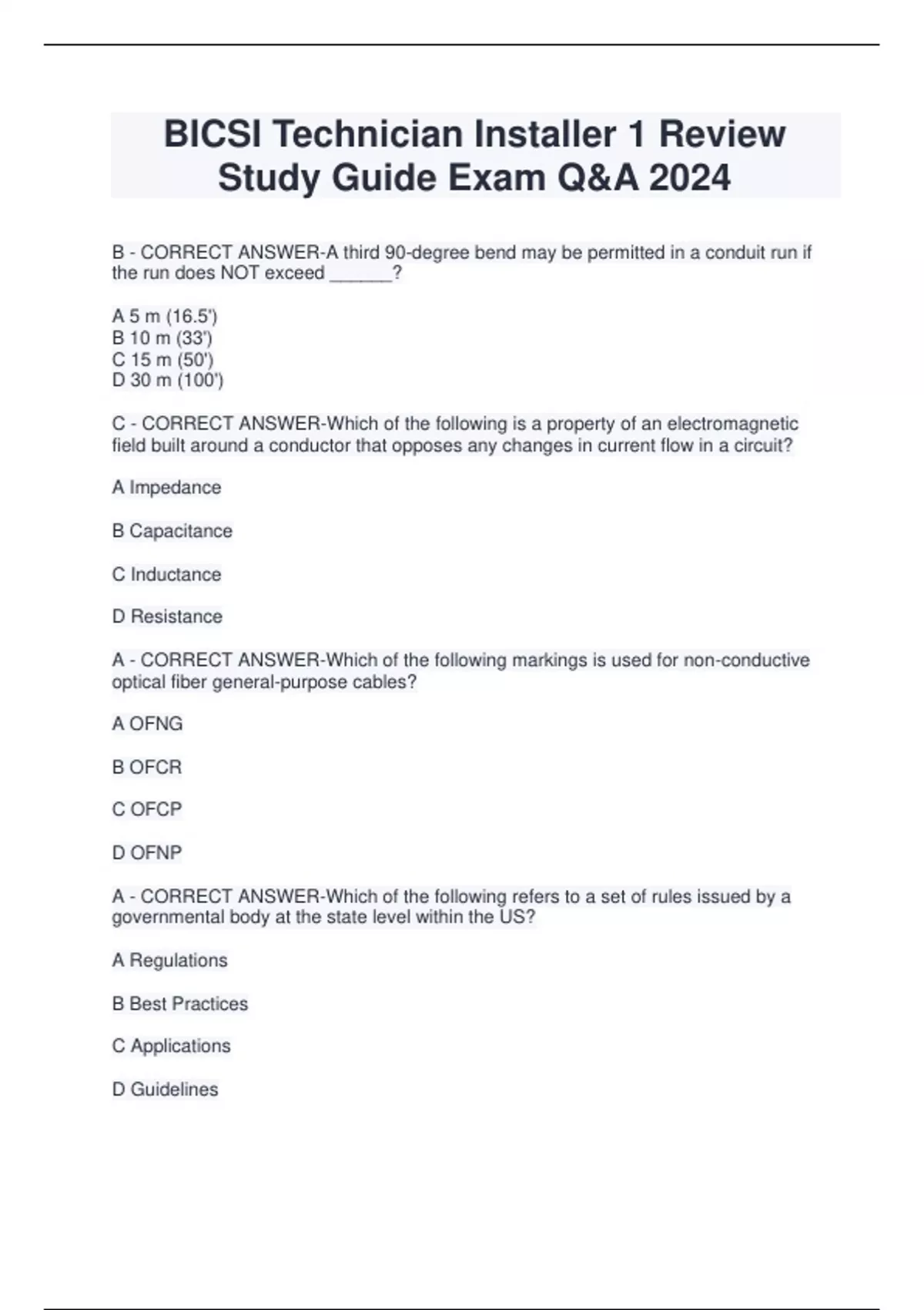 BICSI Technician Installer 1 Review Study Guide Exam Q&A 2024 B - CORRECT ANSWER-A third 90-degree bend may be permitted in a conduit run if the run does NOT exceed ______? A 5 m (16.5') B 10 m (33') C 15 m (50') D 30 m (100') C - CORRECT ANSWER-Which of the following is a property of an electromagnetic field built around a conductor that opposes any changes in current flow in a circuit? A Impedance B Capacitance C Inductance D Resistance A - CORRECT ANSWER-Which of the following markings is used for non-conductive optical fiber general-purpose cables? A OFNG B OFCR C OFCP D OFNP A - CORRECT ANSWER-Which of the following refers to a set of rules issued by a governmental body at the state level within the US? A Regulations B Best Practices C Applications D Guidelines B - CORRECT ANSWER-What is the specified performance level for Category 6 cable? A 100 MHz B 250 MHz C 500 MHz D 600 MHz A - CORRECT ANSWER-Which type of optical fiber cable should be color coded with an Orange outer cable sheath? A MM with a 100 um core diameter B Dispersion-shifted SM optical fiber C Polarization maintain SM optical fiber D SM optical fiber D - CORRECT ANSWER-Which of the following is the primary benefit of using wallmounted racks and cabinets in place of traditional equipment racks? A Provides equipment with a higher level of protection B Allows for the equipment to be easily rearranged C Optimizes airflow within the equipment room D Takes up less space within the equipment room C - CORRECT ANSWER-Which topology uses a linear configuration that places all network devices on one length of cable? A Star B Ring C Bus D - CORRECT ANSWER-Which of the Two organizations jointly oversee the worldwide standardization of telecommunications cabling? A Alliance for Telecommunications Industry Solutions (ATIS) and Society for Cable Telecommunications Engineers (SCTE) B National Electrical Contractors Association (NECA) and National Fire Protection Association (NFPA) C Comite Europeen de Normalisation Electrotechnique (CENELEC) and Electronic Industries Association (EIA) D International Organization for Standardization (ISO) and International Electrotechnical Commission (IEC) B - CORRECT ANSWER-Which of the following is designed to provide protection from harmful chemicals? A Cut-resistant gloves B Rubber gloves C Leather gloves B - CORRECT ANSWER-Which of the following is a building-serving space that houses large pieces of common active equipment? A TR B ER C TE D Mechanical Room E Battery room C - CORRECT ANSWER-Which phase of testing includes documenting the test results? A Phase 1 B Phase 2 C Phase 3 A - CORRECT ANSWER-Which of the following are typically used to support cables between a cable tray and work area outlets