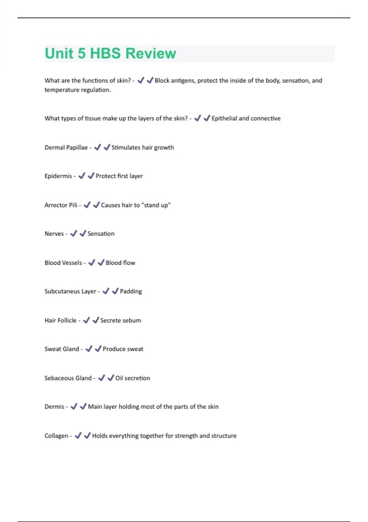 What are the functions of skin? - Block antigens, protect the inside of the body, sensation, and temperature regulation. What types of tissue make up the layers of the skin? - Epithelial and connective Dermal Papillae - Stimulates hair growth Epidermis - Protect first layer Arrector Pili - Causes hair to "stand up" Nerves - Sensation Blood Vessels - Blood flow Subcutaneus Layer - Padding Hair Follicle - Secrete sebum Sweat Gland - Produce sweat Sebaceous Gland - Oil secretion Dermis - Main layer holding most of the parts of the skin Collagen - Holds everything together for strength and structureElastin - Resume stretch or contract Keratin - Pigment that gives skin, hair, and eyes color What happens to skin as it is exposed to sunlight? - Stimulates production of large melanin granules What happens to skin as a person ages? - Acne clears, thinner epidermis, skin begins to sag, wrinkles, skin loses fat, collagen, and elastin, melanocytes cluster causing age spots 1st Degree Burn - Damages epidermis