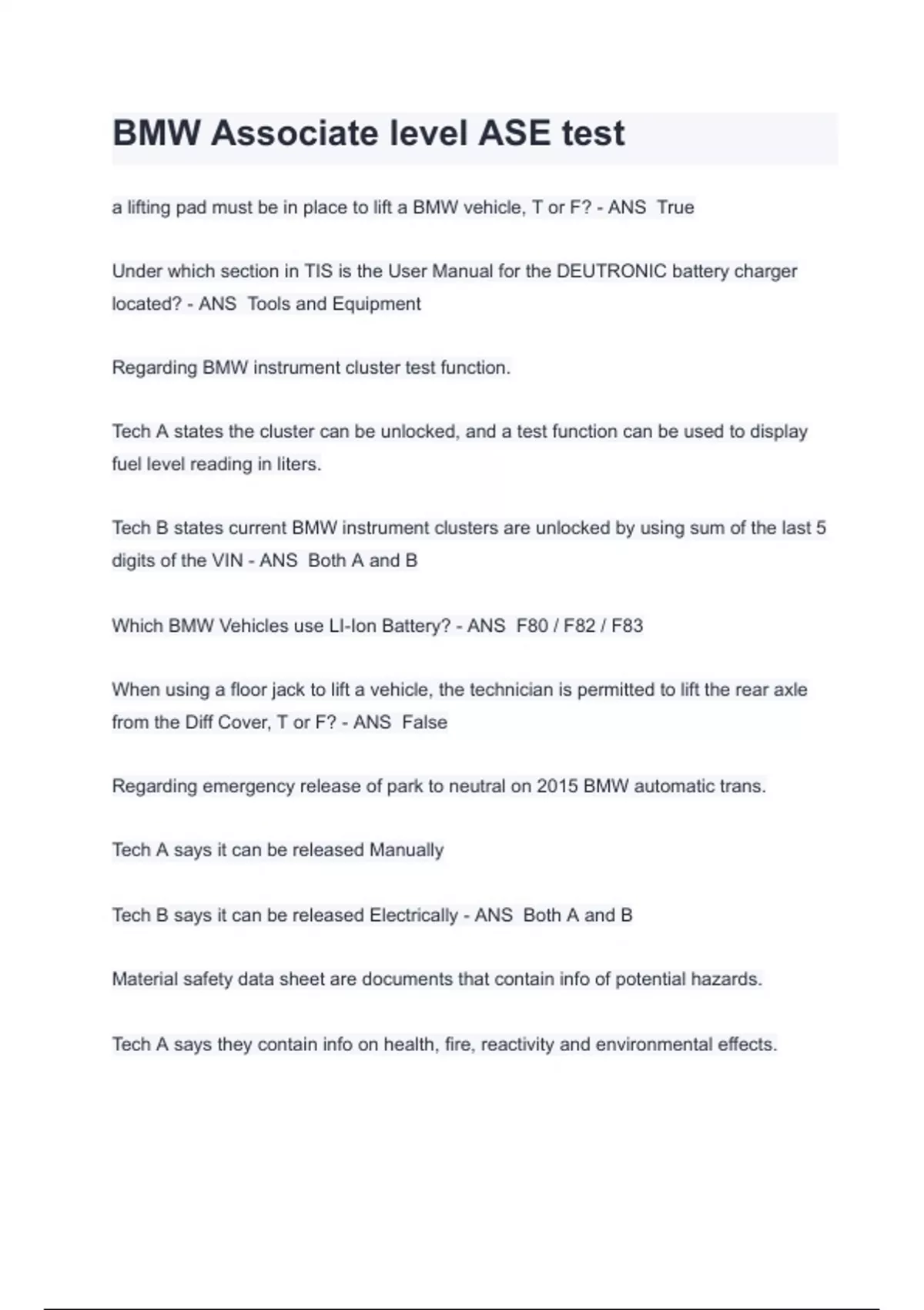 BMW Associate level ASE test 2024 Questions With Correct Answers!! a lifting pad must be in place to lift a BMW vehicle, T or F? - ANS True Under which section in TIS is the User Manual for the DEUTRONIC battery charger located? - ANS Tools and Equipment Regarding BMW instrument cluster test function. Tech A states the cluster can be unlocked, and a test function can be used to display fuel level reading in liters. Tech B states current BMW instrument clusters are unlocked by using sum of the last 5 digits of the VIN - ANS Both A and B Which BMW Vehicles use LI-Ion Battery? - ANS F80 / F82 / F83 When using a floor jack to lift a vehicle, the technician is permitted to lift the rear axle from the Diff Cover, T or F? - ANS False Regarding emergency release of park to neutral on 2015 BMW automatic trans. Tech A says it can be released Manually Tech B says it can be released Electrically - ANS Both A and B Material safety data sheet are documents that contain info of potential hazards. Tech A says they contain info on health, fire, reactivity and environmental effects.