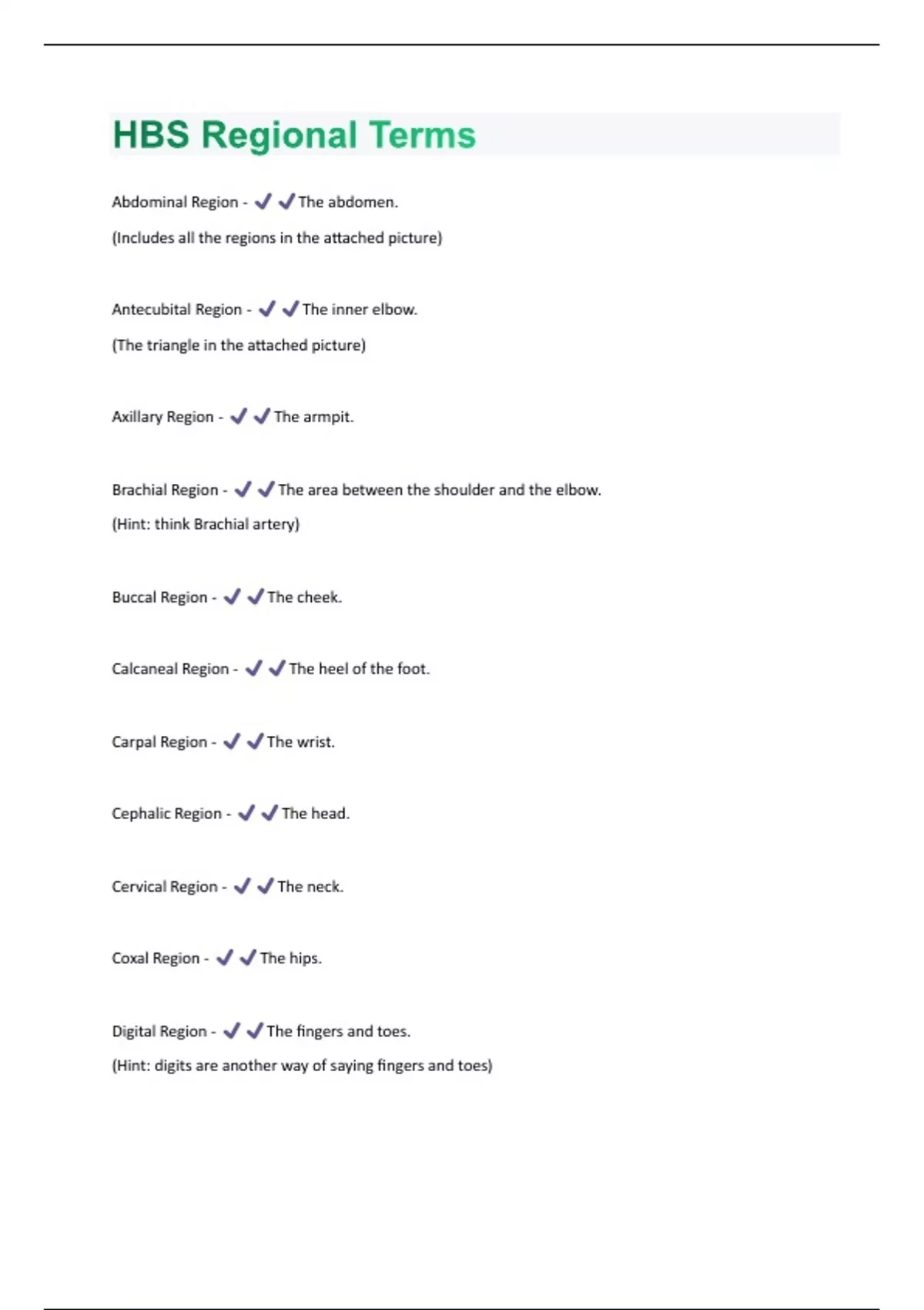 Abdominal Region - The abdomen. (Includes all the regions in the attached picture) Antecubital Region - The inner elbow. (The triangle in the attached picture) Axillary Region - The armpit. Brachial Region - The area between the shoulder and the elbow. (Hint: think Brachial artery) Buccal Region - The cheek. Calcaneal Region - The heel of the foot. Carpal Region - The wrist. Cephalic Region - The head. Cervical Region - The neck. Coxal Region - The hips. Digital Region - The fingers and toes. (Hint: digits are another way of saying fingers and toes)Femoral Region - The thigh. (Hint: the femur is the bone in the thigh, and the femoral triangle is closer to the point of attachment) (Labeled Y on the attached picture) Gluteal Region - The buttocks. Inguinal Region - The groin / The lower lateral parts parts of the abdomen. (Labeled G and I on the attached picture) Lumbar Region - The lower back/spine. Nasal Region - The nose. Occipital Region - The back of the head. (Hint: if you know the brain, think about the occipital lobe located towards the back of the head) Olecranal Region - The (back of the) elbow. (labeled R in the attached picture) Oral Region - The mouth. Orbital Region - The area around the eye(s). Patellar Region - The knee (cap). (Labeled 6 in the attached picture) Pelvic Region - The pelvis.Popliteal Region - Backside of the knee. (Labeled AA in the attached picture) Sacral Region - The tail of the spinal column (also called the TAIL BONE). Scapular Region - The shoulder bone/blade. Sternal Region - The sternum/breastbone.