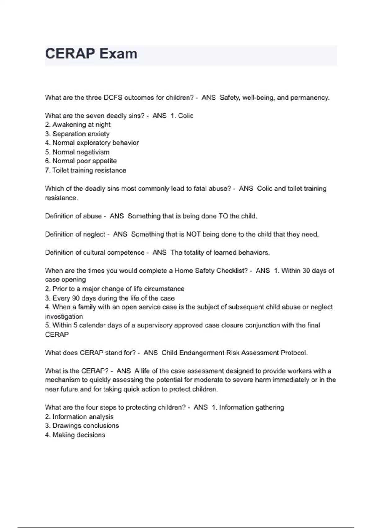 CERAP Exam Questions And Answers What are the three DCFS outcomes for children? - ANS Safety, well-being, and permanency. What are the seven deadly sins? - ANS 1. Colic 2. Awakening at night 3. Separation anxiety 4. Normal exploratory behavior 5. Normal negativism 6. Normal poor appetite 7. Toilet training resistance Which of the deadly sins most commonly lead to fatal abuse? - ANS Colic and toilet training resistance. Definition of abuse - ANS Something that is being done TO the child. Definition of neglect - ANS Something that is NOT being done to the child that they need. Definition of cultural competence - ANS The totality of learned behaviors.