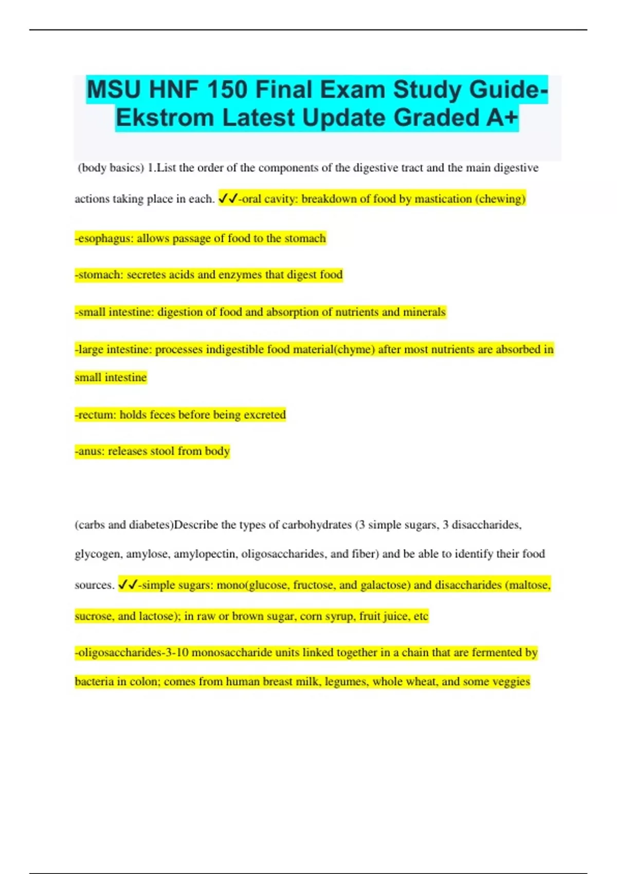 MSU HNF 150 Final Exam Study Guide- Ekstrom Latest Update Graded A+ (body basics) 1.List the order of the components of the digestive tract and the main digestive actions taking place in each. -oral cavity: breakdown of food by mastication (chewing) -esophagus: allows passage of food to the stomach -stomach: secretes acids and enzymes that digest food -small intestine: digestion of food and absorption of nutrients and minerals -large intestine: processes indigestible food material(chyme) after most nutrients are absorbed in small intestine -rectum: holds feces before being excreted -anus: releases stool from body (carbs and diabetes)Describe the types of carbohydrates (3 simple sugars, 3 disaccharides, glycogen, amylose, amylopectin, oligosaccharides, and fiber) and be able to identify their food sources. -simple sugars: mono(glucose, fructose, and galactose) and disaccharides (maltose, sucrose, and lactose); in raw or brown sugar, corn syrup, fruit juice, etc -oligosaccharides-3-10 monosaccharide units linked together in a chain that are fermented by bacteria in colon; comes from human breast milk, legumes, whole wheat, and some veggies -polysaccharides-long strands of glucose: plant starch and animal glycogen (glycogenanimal( branched), amylopectin-plant starch(branched), and amylose-plant starch(one branch)); found in starch so cereal, wheat, oats, barley, etc. -fiber: part of plant that our small intestine cannot digest, some of which is broken down or fermented by bacteria in the large intestine- soluble and insoluble fiber; found in legumes, beans, veggies, fruits, nuts, etc. (lipids and cardiovascular disease) Describe the process of digestion and absorption of triglycerides, and small and large chain fatty acids. A triglyceride is formed from 1 glycerol + 3 fatty acids. Trigylceride digestion in the GI tract Little digestion takes place in the mouth In the stomach fat droplets separate from the watery components and float as a layer on top. In the small intestine, bile emulsifies the fat droplets within the watery fluids and the digesting enzymes split them into free fatty acids, glycerol, and monoglycerides. Bile again helps the intestinal cells absorb the fat (minerals) Recognize the roles of minerals in maintaining fluid, electrolyte, and acid-base balance. Minerals form salts that dissolve in the body and direct where water goes because water follows salt. They separate into electrically charged particles called electrolytes. To control the flow of water, the body moves these electrolytes from one body compartment to another to keep a proper balance, Mineral salts also serve as a buffer to help control pH level, allowing all life processes to take place (nutrition basics) 1. Understand the concept of nutrient density and state how it can be used to determine the healthfulness of foods -foods rich in nutrients relative to their energy content (calories), usually whole foods -higher nutrients and lower calories=nutrient dense (nutrition recommendations/how do we know what we know) 1. State how the DRI's (RDA and EER) for energy and other nutrients are established -the food and nutrition board, institute of medicine, national academy of sciences, Washington, DC Nutrition and Food Scientists review scientific studies of deficiencies, how much you body stores of the nutrient, what can cause depletion of the nutrient, and what other factors influence these factors and make the DRI based off of these indicators -DHHS and USDA appoint an Advisory Committee to create an Advisory Report to be submitted to the Secretaries of DHHS and USDAThe report is informed by:Systematic reviews of scientific research (diet/health outcomes), Review of existing systematic reviews, metaanalyses and reports by federal agencies or leading scientific organizations, Data analyses of current food intakes, Food pattern modeling (pregnancy) Explain why a nutritionally adequate diet is