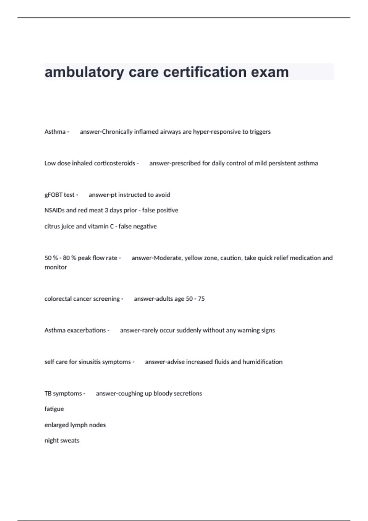 Asthma - answer-Chronically inflamed airways are hyper-responsive to triggers Low dose inhaled corticosteroids - answer-prescribed for daily control of mild persistent asthma gFOBT test - answer-pt instructed to avoid NSAIDs and red meat 3 days prior - false positive citrus juice and vitamin C - false negative 50 % - 80 % peak flow rate - answer-Moderate, yellow zone, caution, take quick relief medication and monitor colorectal cancer screening - answer-adults age 50 - 75 Asthma exacerbations - answer-rarely occur suddenly without any warning signs self care for sinusitis symptoms - answer-advise increased fluids and humidification TB symptoms - answer-coughing up bloody secretions fatigue enlarged lymph nodes night sweats