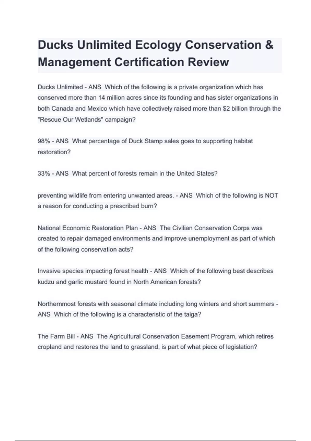 Ducks Unlimited Ecology Conservation & Management Certification Review Ducks Unlimited - ANS Which of the following is a private organization which has conserved more than 14 million acres since its founding and has sister organizations in both Canada and Mexico which have collectively raised more than $2 billion through the "Rescue Our Wetlands" campaign? 98% - ANS What percentage of Duck Stamp sales goes to supporting habitat restoration? 33% - ANS What percent of forests remain in the United States? preventing wildlife from entering unwanted areas. - ANS Which of the following is NOT a reason for conducting a prescribed burn? National Economic Restoration Plan - ANS The Civilian Conservation Corps was created to repair damaged environments and improve unemployment as part of which of the following conservation acts? Invasive species impacting forest health - ANS Which of the following best describes kudzu and garlic mustard found in North American forests? Northernmost forests with seasonal climate including long winters and short summers - ANS Which of the following is a characteristic of the taiga? The Farm Bill - ANS The Agricultural Conservation Easement Program, which retires cropland and restores the land to grassland, is part of what piece of legislation?