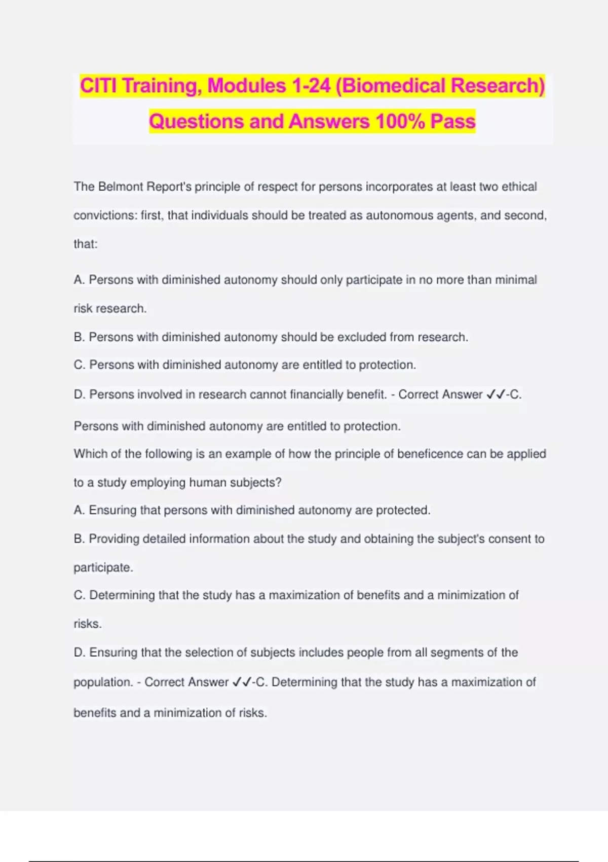CITI Training, Modules 1-24 (Biomedical Research) Questions and Answers 100% Pass The Belmont Report's principle of respect for persons incorporates at least two ethical convictions: first, that individuals should be treated as autonomous agents, and second, that: A. Persons with diminished autonomy should only participate in no more than minimal risk research. B. Persons with diminished autonomy should be excluded from research. C. Persons with diminished autonomy are entitled to protection. D. Persons involved in research cannot financially benefit. - Correct Answer ️️ -C. Persons with diminished autonomy are entitled to protection. Which of the following is an example of how the principle of beneficence can be applied to a study employing human subjects? A. Ensuring that persons with diminished autonomy are protected. B. Providing detailed information about the study and obtaining the subject's consent to participate. C. Determining that the study has a maximization of benefits and a minimization of risks. D. Ensuring that the selection of subjects includes people from all segments of the population. - Correct Answer ️️ -C. Determining that the study has a maximization of benefits and a minimization of risks. Which of the following are the three principles discussed in the Belmont Report? A. IRB Review, Federal Regulations, Declaration of Helsinki B. Privacy, Confidentiality, Equitable Selection of Subjects C. Informed Consent, Institutional Assurance, Researcher Responsibility D. Respect for Persons, Beneficence, Justice - Correct Answer ️️ -D. Respect for Persons, Beneficence, Justice When an IRB is reviewing a research study and they are considering if a potential subject population is vulnerable, they should consider: A. Are there adequate resources to conduct the study? B. Is there a power differential between researchers and subjects? C. Has the researcher completed required training? D. Are the research procedures greater than minimal risk of harm? - Correct Answer ️️ -B. Is there a power differential between researchers and subjects? Which is an example of a situation where deferential vulnerability might be a factor? A. An army medical officer recruiting subjects among lower ranks B. A college professor recruiting among their students C. A physician recruiting patients to be subjects D. An employer recruiting among persons who directly report to them - Correct Answer ️️ -C. A physician recruiting patients to be subjects In considering NBAC's analytic approach, an otherwise competent person who is acutely ill might be considered at especially high risk of harm for: A. Economic vulnerability B. Situational cognitive vulnerability C. Capacity-related cognitive vulnerability D. Communicative vulnerability - Correct Answer ️️ -B. Situational cognitive vulnerability Identify the following groups that are protected in the federal regulations (45 CFR 46), specifically in Subparts B, C, and D with additional protections: A. Pregnant women, prisoners, and mentally disabled B. Children, prisoners, and terminally ill C. Prisoners, children, and elderly D. Pregnant women, prisoners, children - Correct Answer ️️ -D. Pregnant women, prisoners, children The NBAC looks at characteristics individuals might have that would prevent them from being able to provide voluntary informed consent. The traits may be thought of as falling into six broad areas: cognitive or communicative, institutional, deferential, medical, economic, and social. Prospective research subjects who are not able to comprehend information, deliberate, and make decisions about participation in a proposed research study have a: A. Institutional vulnerability B. Cognitive or communicative vulnerability C. Physical vulnerability D. Economic or social vulnerability - Correct Answer ️️ -B. Cognitive or communicative vulnerability The use of prisoners in research is a concern under the Belmont principle of Justi