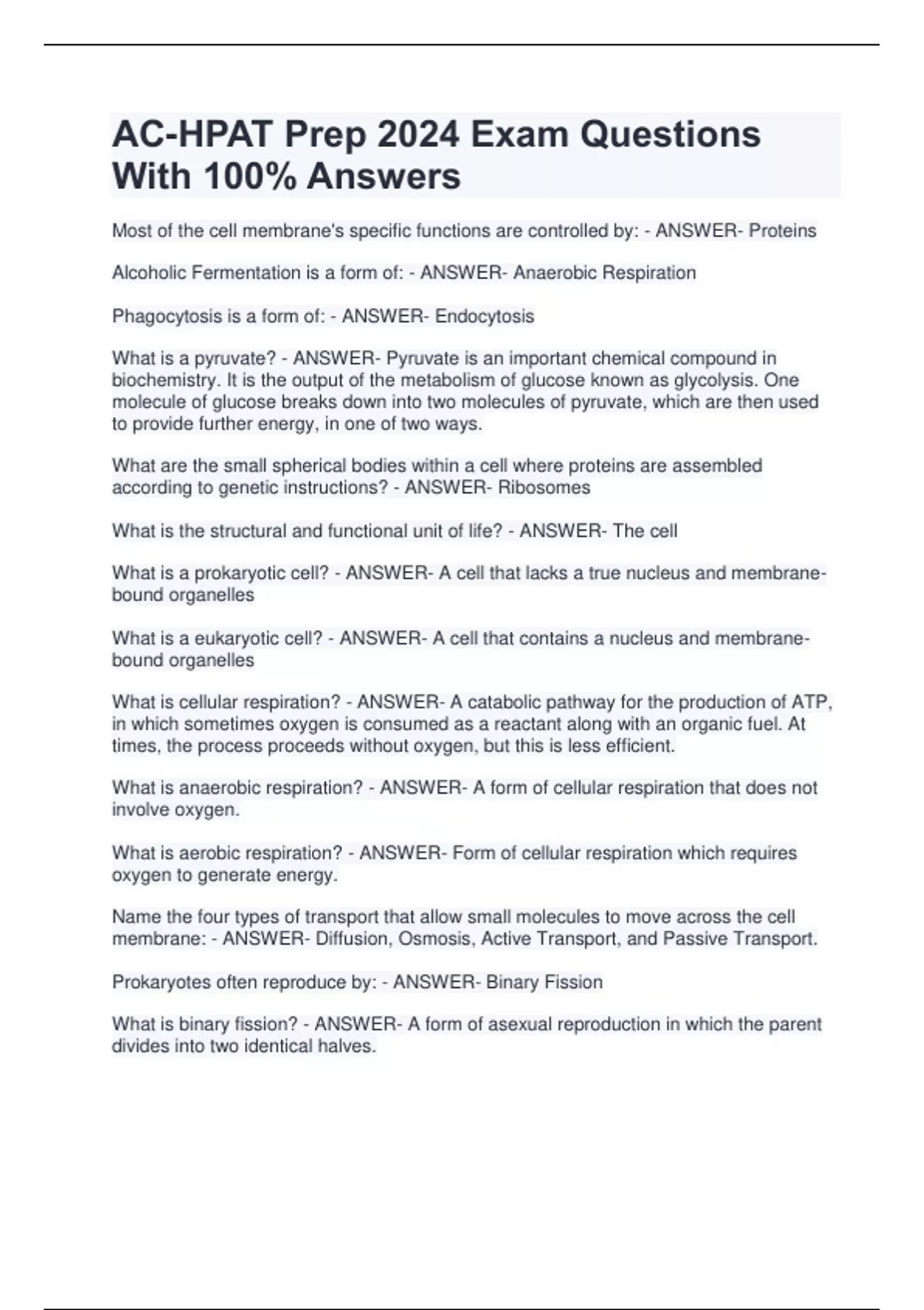 AC-HPAT Prep: Biology 2024 Exam Answers Most of the cell membrane's specific functions are controlled by: - ANSWER- Proteins Alcoholic Fermentation is a form of: - ANSWER- Anaerobic Respiration Phagocytosis is a form of: - ANSWER- Endocytosis What is a pyruvate? - ANSWER- Pyruvate is an important chemical compound in biochemistry. It is the output of the metabolism of glucose known as glycolysis. One molecule of glucose breaks down into two molecules of pyruvate, which are then used to provide further energy, in one of two ways. What are the small spherical bodies within a cell where proteins are assembled according to genetic instructions? - ANSWER- Ribosomes What is the structural and functional unit of life? - ANSWER- The cell What is a prokaryotic cell? - ANSWER- A cell that lacks a true nucleus and membranebound organelles What is a eukaryotic cell? - ANSWER- A cell that contains a nucleus and membranebound organelles What is cellular respiration? - ANSWER- A catabolic pathway for the production of ATP, in which sometimes oxygen is consumed as a reactant along with an organic fuel. At times, the process proceeds without oxygen, but this is less efficient. What is anaerobic respiration? - ANSWER- A form of cellular respiration that does not involve oxygen. What is aerobic respiration? - ANSWER- Form of cellular respiration which requires oxygen to generate energy.