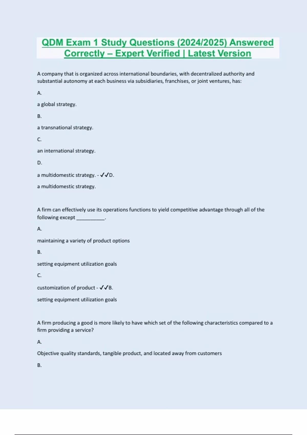 QDM Exam 1 Study Questions (2024/2025) Answered Correctly – Expert Verified | Latest Version