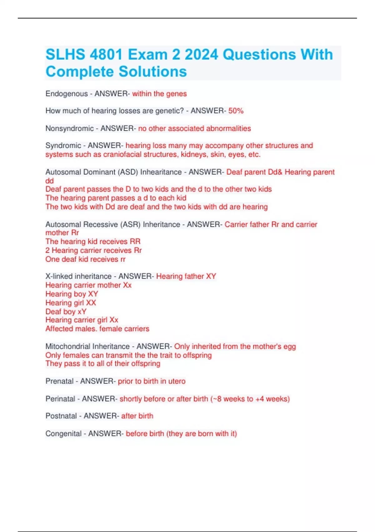 SLHS 4801 Exam 2 2024 Questions With Complete Solutions Endogenous - ANSWER- within the genes How much of hearing losses are genetic? - ANSWER- 50% Nonsyndromic - ANSWER- no other associated abnormalities Syndromic - ANSWER- hearing loss many may accompany other structures and systems such as craniofacial structures, kidneys, skin, eyes, etc. Autosomal Dominant (ASD) Inhearitance - ANSWER- Deaf parent Dd& Hearing parent dd Deaf parent passes the D to two kids and the d to the other two kids The hearing parent passes a d to each kid The two kids with Dd are deaf and the two kids with dd are hearing Autosomal Recessive (ASR) Inheritance - ANSWER- Carrier father Rr and carrier mother Rr The hearing kid receives RR 2 Hearing carrier receives Rr One deaf kid receives rr X-linked inheritance - ANSWER- Hearing father XY Hearing carrier mother Xx Hearing boy XY Hearing girl XX Deaf boy xY Hearing carrier girl Xx Affected males. female carriers Mitochondrial Inheritance - ANSWER- Only inherited from the mother's egg Only females can transmit the the trait to offspring They pass it to all of their offspring