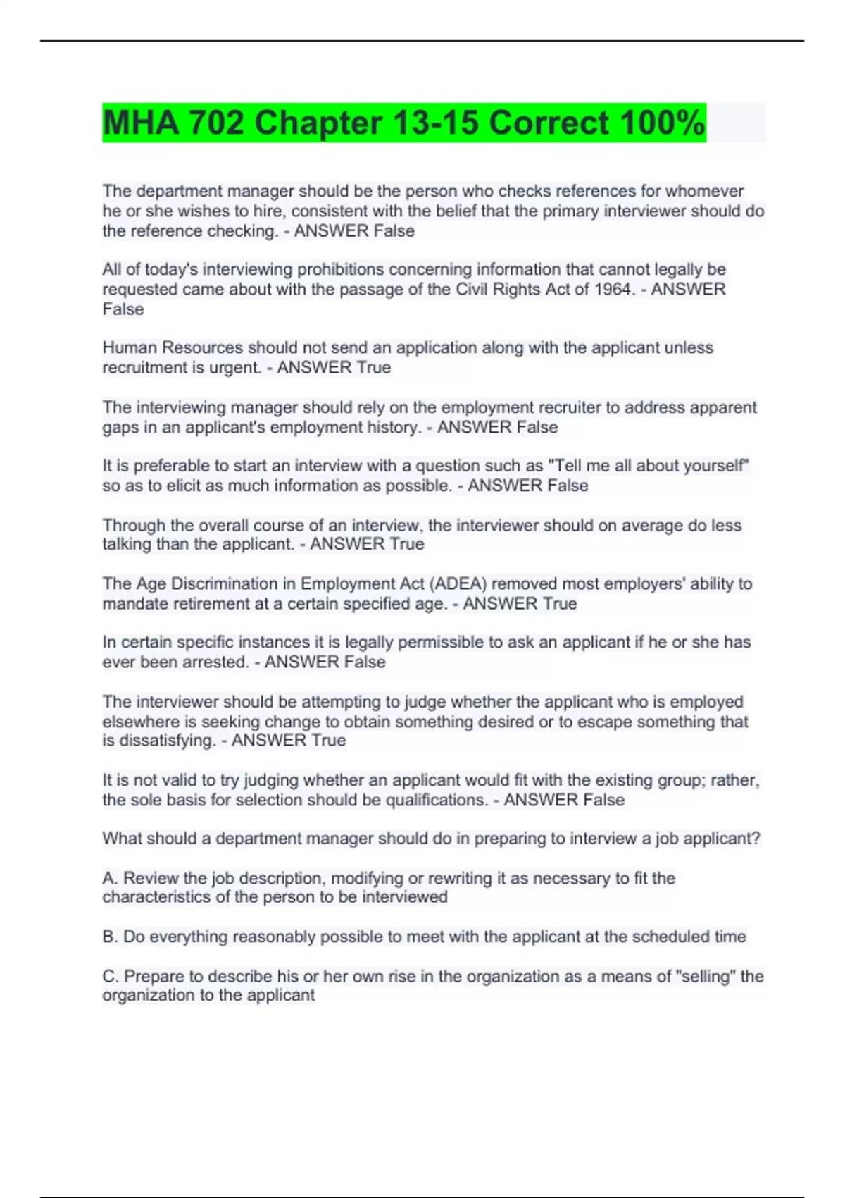 The department manager should be the person who checks references for whomever he or she wishes to hire, consistent with the belief that the primary interviewer should do the reference checking. - ANSWER False All of today's interviewing prohibitions concerning information that cannot legally be requested came about with the passage of the Civil Rights Act of 1964. - ANSWER False Human Resources should not send an application along with the applicant unless recruitment is urgent. - ANSWER True The interviewing manager should rely on the employment recruiter to address apparent gaps in an applicant's employment history. - ANSWER False
