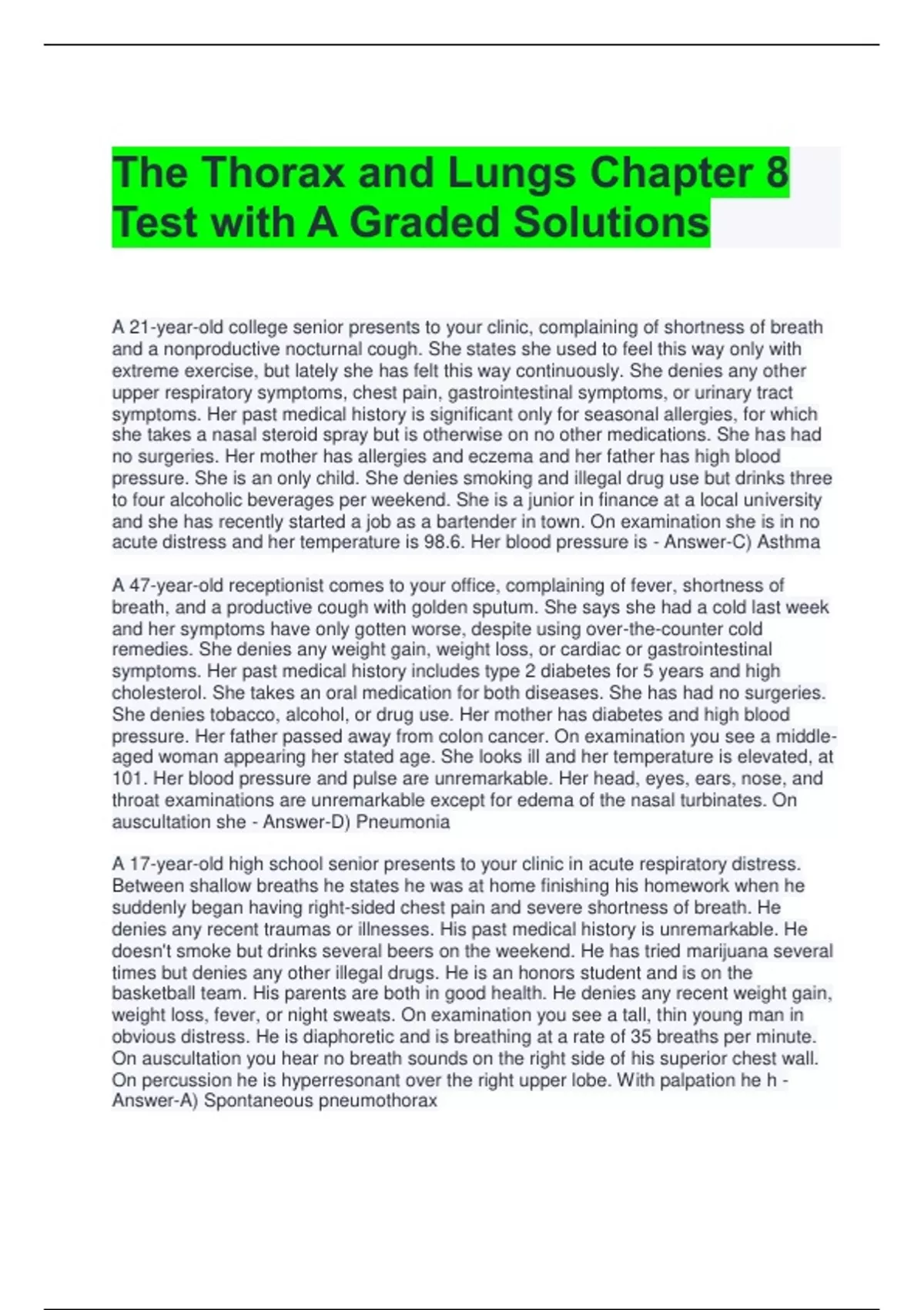 The Thorax and Lungs Chapter 8 Test with A Graded Solutions A 21-year-old college senior presents to your clinic, complaining of shortness of breath and a nonproductive nocturnal cough. She states she used to feel this way only with extreme exercise, but lately she has felt this way continuously. She denies any other upper respiratory symptoms, chest pain, gastrointestinal symptoms, or urinary tract symptoms. Her past medical history is significant only for seasonal allergies, for which she takes a nasal steroid spray but is otherwise on no other medications. She has had no surgeries. Her mother has allergies and eczema and her father has high blood pressure. She is an only child. She denies smoking and illegal drug use but drinks three to four alcoholic beverages per weekend. She is a junior in finance at a local university and she has recently started a job as a bartender in town. On examination she is in no acute distress and her temperature is 98.6. Her blood pressure is - Answer-C) Asthma A 47-year-old receptionist comes to your office, complaining of fever, shortness of breath, and a productive cough with golden sputum. She says she had a cold last week and her symptoms have only gotten worse, despite using over-the-counter cold remedies. She denies any weight gain, weight loss, or cardiac or gastrointestinal symptoms. Her past medical history includes type 2 diabetes for 5 years and high cholesterol. She takes an oral medication for both diseases. She has had no surgeries. She denies tobacco, alcohol, or drug use. Her mother has diabetes and high blood pressure. Her father passed away from colon cancer. On examination you see a middle-aged woman appearing her stated age. She looks ill and her temperature is elevated, at 101. Her blood pressure and pulse are unremarkable. Her head, eyes, ears, nose, and throat examinations are unremarkable except for edema of the nasal turbinates. On auscultation she - Answer-D) Pneumonia A 17-year-old high school senior presents to your clinic in acute respiratory distress. Between shallow breaths he states he was at home finishing his homework when he suddenly began having right-sided chest pain and severe shortness of breath. He denies any recent traumas or illnesses. His past medical history is unremarkable. He doesn't smoke but drinks several beers on the weekend. He has tried marijuana several times but denies any other illegal drugs. He is an honors student and is on the basketball team. His parents are both in good health. He denies any recent weight gain, weight loss, fever, or night sweats. On examination you see a tall, thin young man in obvious distress. He is diaphoretic and is breathing at a rate of 35 breaths per minute. On auscultation you hear no breath sounds on the right side of his superior chest wall. On percussion he is hyperresonant over the right upper lobe. With palpation he h - Answer-A) Spontaneous pneumothorax