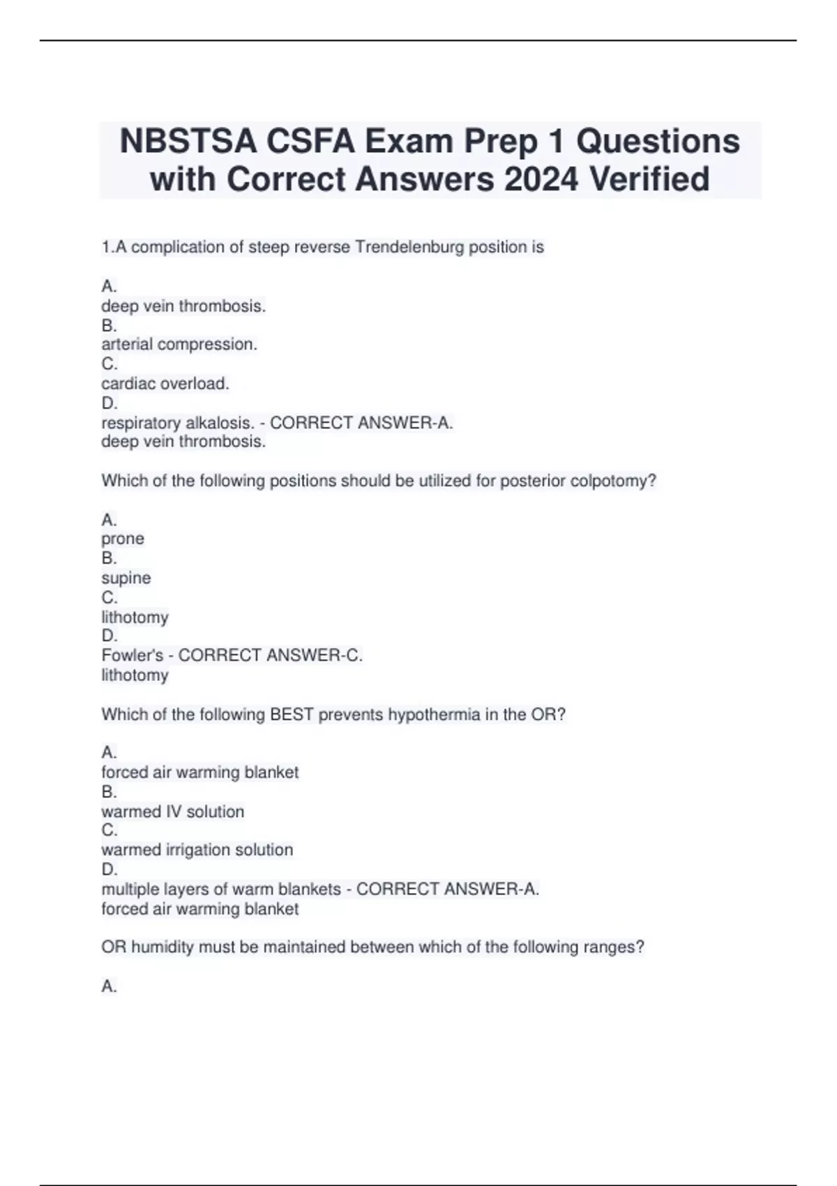 NBSTSA CSFA Exam Prep 1 Questions with Correct Answers 2024 Verified 1.A complication of steep reverse Trendelenburg position is A. deep vein thrombosis. B. arterial compression. C. cardiac overload. D. respiratory alkalosis. - CORRECT ANSWER-A. deep vein thrombosis. Which of the following positions should be utilized for posterior colpotomy? A. prone B. supine C. lithotomy D. Fowler's - CORRECT ANSWER-C. lithotomy Which of the following BEST prevents hypothermia in the OR? A. forced air warming blanket B. warmed IV solution C. warmed irrigation solution D. multiple layers of warm blankets - CORRECT ANSWER-A. forced air warming blanket OR humidity must be maintained between which of the following ranges? A. 5% to 20% B. 20% to 60% C. 40% to 80% D. 50% to 90% - CORRECT ANSWER-B.