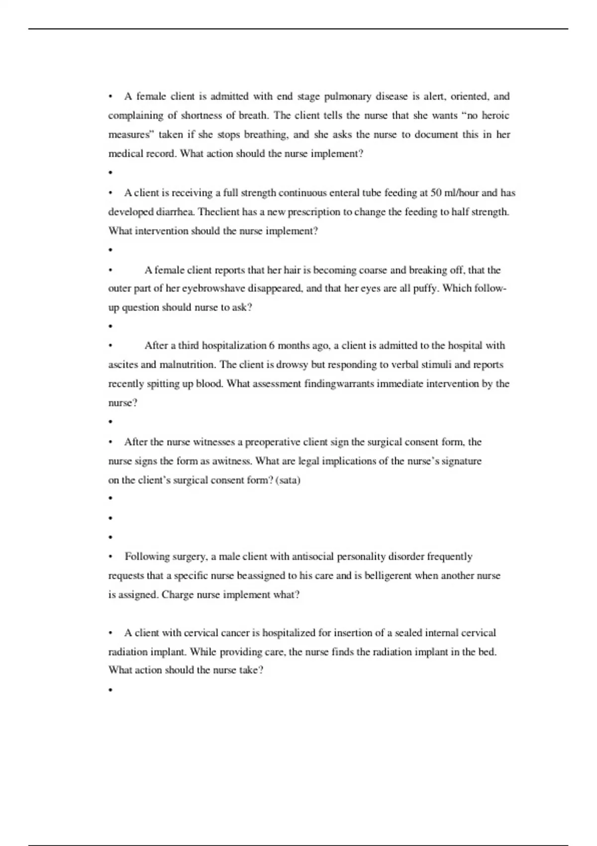 • A female client is admitted with end stage pulmonary disease is alert, oriented, and complaining of shortness of breath. The client tells the nurse that she wants “no heroic measures” taken if she stops breathing, and she asks the nurse to document this in her medical record. What action should the nurse implement? • • A client is receiving a full strength continuous enteral tube feeding at 50 ml/hour and has developed diarrhea. Theclient has a new prescription to change the feeding to half strength. What intervention should the nurse implement? • • A female client reports that her hair is becoming coarse and breaking off, that the outer part of her eyebrowshave disappeared, and that her eyes are all puffy. Which followup question should nurse to ask? • • After a third hospitalization 6 months ago, a client is admitted to the hospital with ascites and malnutrition. The client is drowsy but responding to verbal stimuli and reports recently spitting up blood. What assessment findingwarrants immediate intervention by the nurse? • • After the nurse witnesses a preoperative client sign the surgical consent form, the nurse signs the form as awitness. What are legal implications of the nurse’ssignature on the client’s surgical consent form? (sata) • • • • Following surgery, a male client with antisocial personality disorder frequently requests that a specific nurse be assigned to his care and is belligerent when another nurse is assigned. Charge nurse implement what? • A client with cervical cancer is hospitalized for insertion of a sealed internal cervical radiation implant. While providing care, the nurse finds the radiation implant in the bed. What action should the nurse take? • • The client with which type of wound is most likely to need immediate intervention by the nurse? • • The nurse is planning care for client admitted with a diagnosis of pheochromocytoma. Intervention? • Monitor blood pressure frequently • When caring for a client who has acute respiratory distress syndrome (ARDS), the nurse elevates the head of the bed 30 degrees. What is the reason for this intervention?