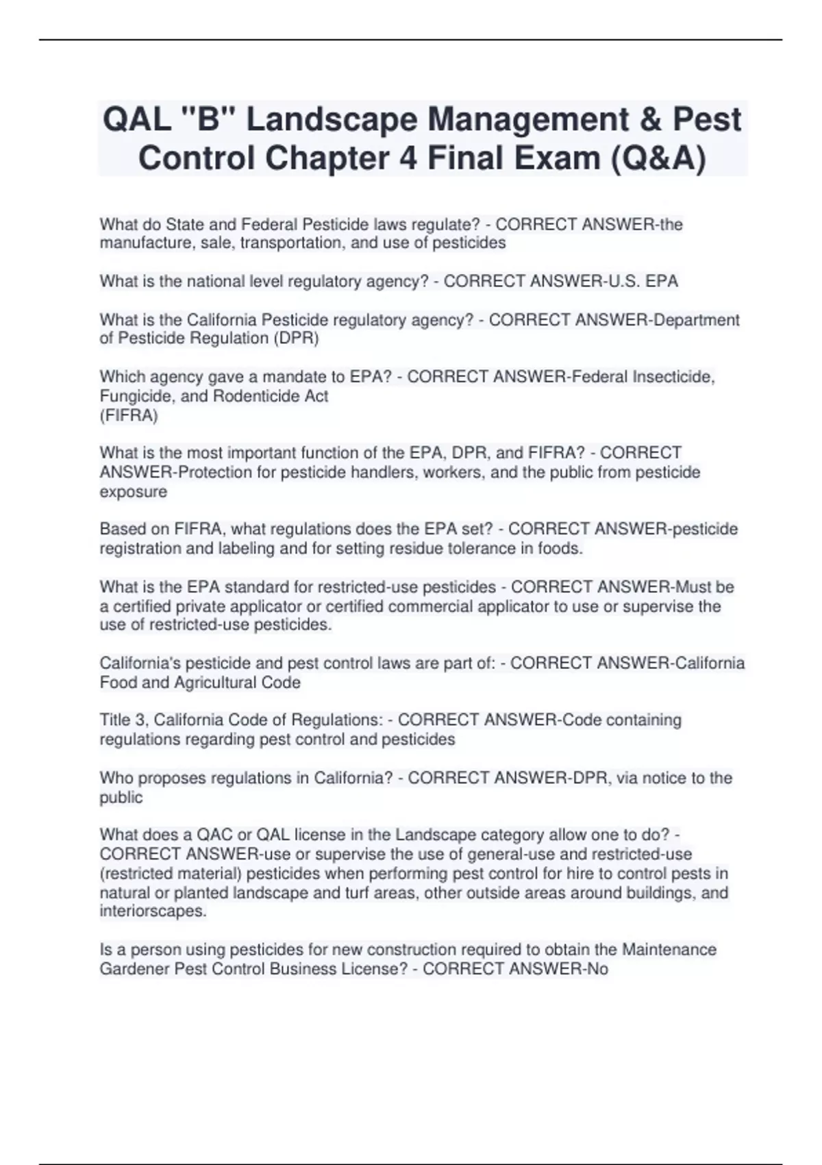 QAL "B" Landscape Management & Pest Control Chapter 4 Final Exam (Q&A) What do State and Federal Pesticide laws regulate? - CORRECT ANSWER-the manufacture, sale, transportation, and use of pesticides What is the national level regulatory agency? - CORRECT ANSWER-U.S. EPA What is the California Pesticide regulatory agency? - CORRECT ANSWER-Department of Pesticide Regulation (DPR) Which agency gave a mandate to EPA? - CORRECT ANSWER-Federal Insecticide, Fungicide, and Rodenticide Act (FIFRA) What is the most important function of the EPA, DPR, and FIFRA? - CORRECT ANSWER-Protection for pesticide handlers, workers, and the public from pesticide exposure Based on FIFRA, what regulations does the EPA set? - CORRECT ANSWER-pesticide registration and labeling and for setting residue tolerance in foods. What is the EPA standard for restricted-use pesticides - CORRECT ANSWER-Must be a certified private applicator or certified commercial applicator to use or supervise the use of restricted-use pesticides. California's pesticide and pest control laws are part of: - CORRECT ANSWER-California Food and Agricultural Code Title 3, California Code of Regulations: - CORRECT ANSWER-Code containing regulations regarding pest control and pesticides Who proposes regulations in California? - CORRECT ANSWER-DPR, via notice to the public What does a QAC or QAL license in the Landscape category allow one to do? - CORRECT ANSWER-use or supervise the use of general-use and restricted-use (restricted material) pesticides when performing pest control for hire to control pests in natural or planted landscape and turf areas, other outside areas around buildings, and interiorscapes. Is a person using pesticides for new constructio