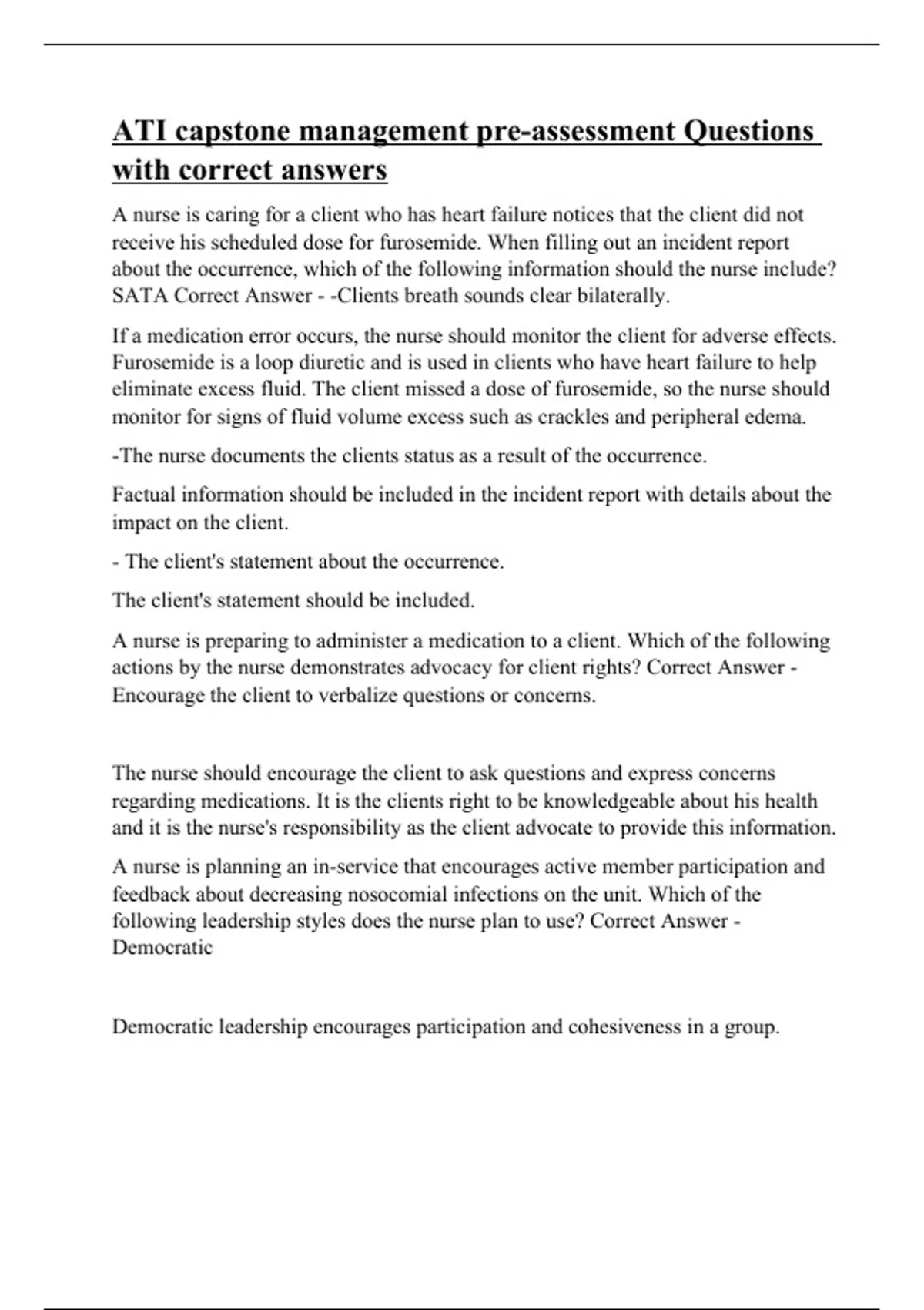 A nurse is caring for a client who has heart failure notices that the client did not receive his scheduled dose for furosemide. When filling out an incident report about the occurrence, which of the following information should the nurse include? SATA Correct Answer - -Clients breath sounds clear bilaterally. If a medication error occurs, the nurse should monitor the client for adverse effects. Furosemide is a loop diuretic and is used in clients who have heart failure to help eliminate excess fluid. The client missed a dose of furosemide, so the nurse should monitor for signs of fluid volume excess such as crackles and peripheral edema. -The nurse documents the clients status as a result of the occurrence. Factual information should be included in the incident report with details about the impact on the client. - The client's statement about the occurrence. The client's statement should be included. A nurse is preparing to administer a medication to a client. Which of the following actions by the nurse demonstrates advocacy for client rights? Correct Answer - Encourage the client to verbalize questions or concerns. The nurse should encourage the client to ask questions and express concerns regarding medications. It is the clients right to be knowledgeable about his health and it is the nurse's responsibility as the client advocate to provide this information. A nurse is planning an in-service that encourages active member participation and feedback about decreasing nosocomial infections on the unit. Which of the following leadership styles does the nurse plan to use? Correct Answer - Democratic Democratic leadership encourages participation and cohesiveness in a group