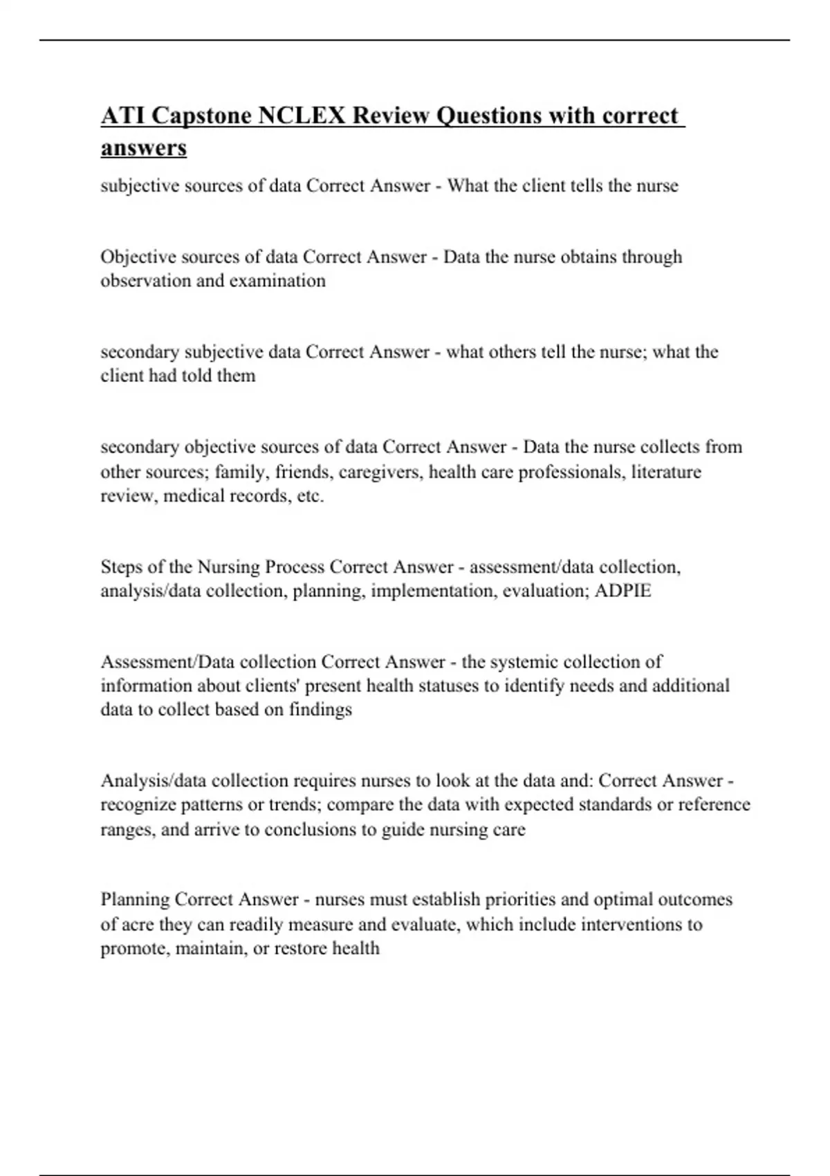 subjective sources of data Correct Answer - What the client tells the nurse Objective sources of data Correct Answer - Data the nurse obtains through observation and examination secondary subjective data Correct Answer - what others tell the nurse; what the client had told them secondary objective sources of data Correct Answer - Data the nurse collects from other sources; family, friends, caregivers, health care professionals, literature review, medical records, etc. Steps of the Nursing Process Correct Answer - assessment/data collection, analysis/data collection, planning, implementation, evaluation; ADPIE Assessment/Data collection Correct Answer - the systemic collection of information about clients' present health statuses to identify needs and additional data to collect based on findings Analysis/data collection requires nurses to look at the data and: Correct Answer - recognize patterns or trends; compare the data with expected standards or reference ranges, and arrive to conclusions to guide nursing care Planning Correct Answer - nurses must establish priorities and optimal outcomes of acre they can readily measure and evaluate, which include interventions to promote, maintain, or restore health