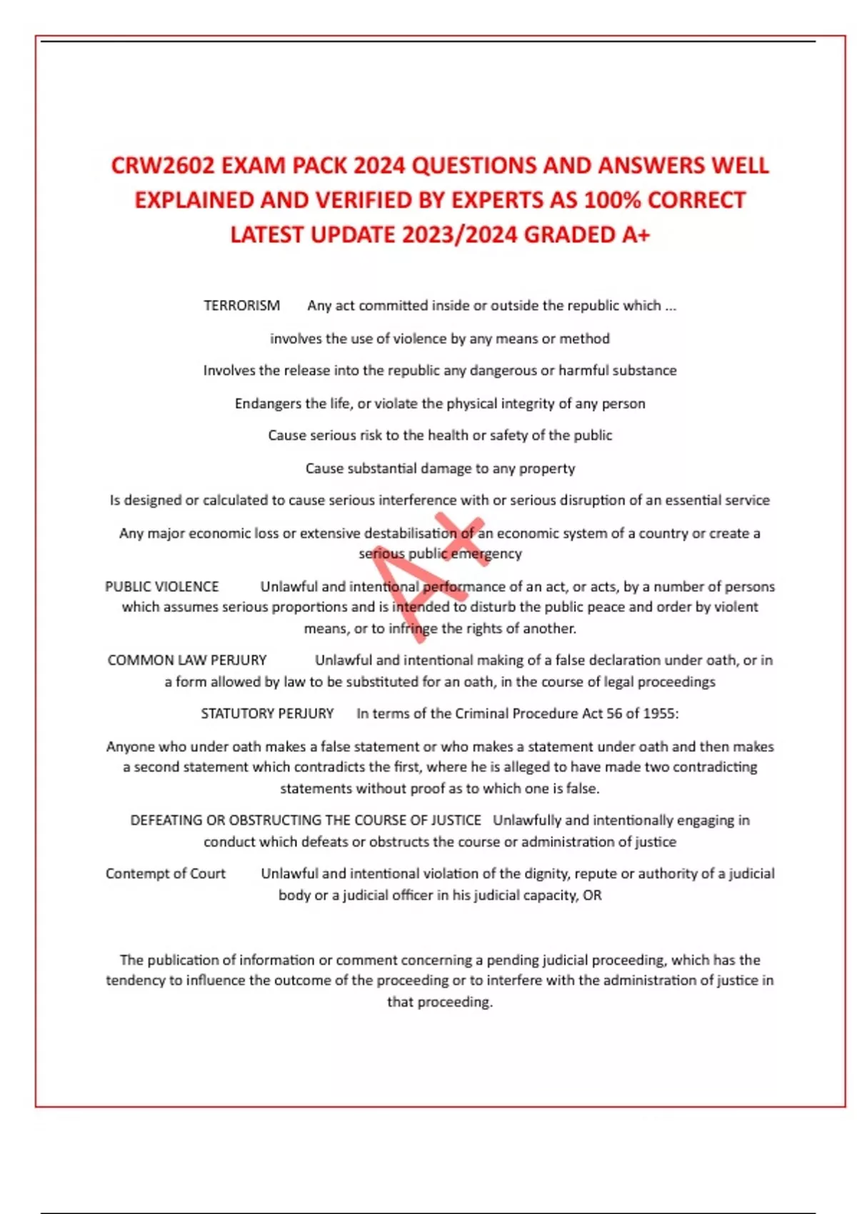CRW2602 EXAM PACK 2024 QUESTIONS AND ANSWERS WELL EXPLAINED AND VERIFIED BY EXPERTS AS 100% CORRECT LATEST UPDATE 2023/2024 GRADED A+ TERRORISM Any act committed inside or outside the republic which ... involves the use of violence by any means or method Involves the release into the republic any dangerous or harmful substance Endangers the life, or violate the physical integrity of any person Cause serious risk to the health or safety of the public Cause substantial damage to any property Is designed or calculated to cause serious interference with or serious disruption of an essential service Any major economic loss or extensive destabilisation of an economic system of a country or create a serious public emergency PUBLIC VIOLENCE Unlawful and intentional performance of an act, or acts, by a number of persons which assumes serious proportions and is intended to disturb the public peace and order by violent means, or to infringe the rights of another. COMMON LAW PERJURY Unlawful and intentional making of a false declaration under oath, or in a form allowed by law to be substituted for an oath, in the course of legal proceedings STATUTORY PERJURY In terms of the Criminal Procedure Act 56 of 1955: Anyone who under oath makes a false statement or who makes a statement under oath and then makes a second statement which contradicts the first, where he is alleged to have made two contradicting statements without proof as to which one is false. DEFEATING OR OBSTRUCTING THE COURSE OF JUSTICE Unlawfully and intentionally engaging in conduct which defeats or obstructs the course or administration of justice Contempt of Court Unlawful and intentional violation of the dignity, repute or authority of a judicial body or a judicial officer in his judicial capacity, OR