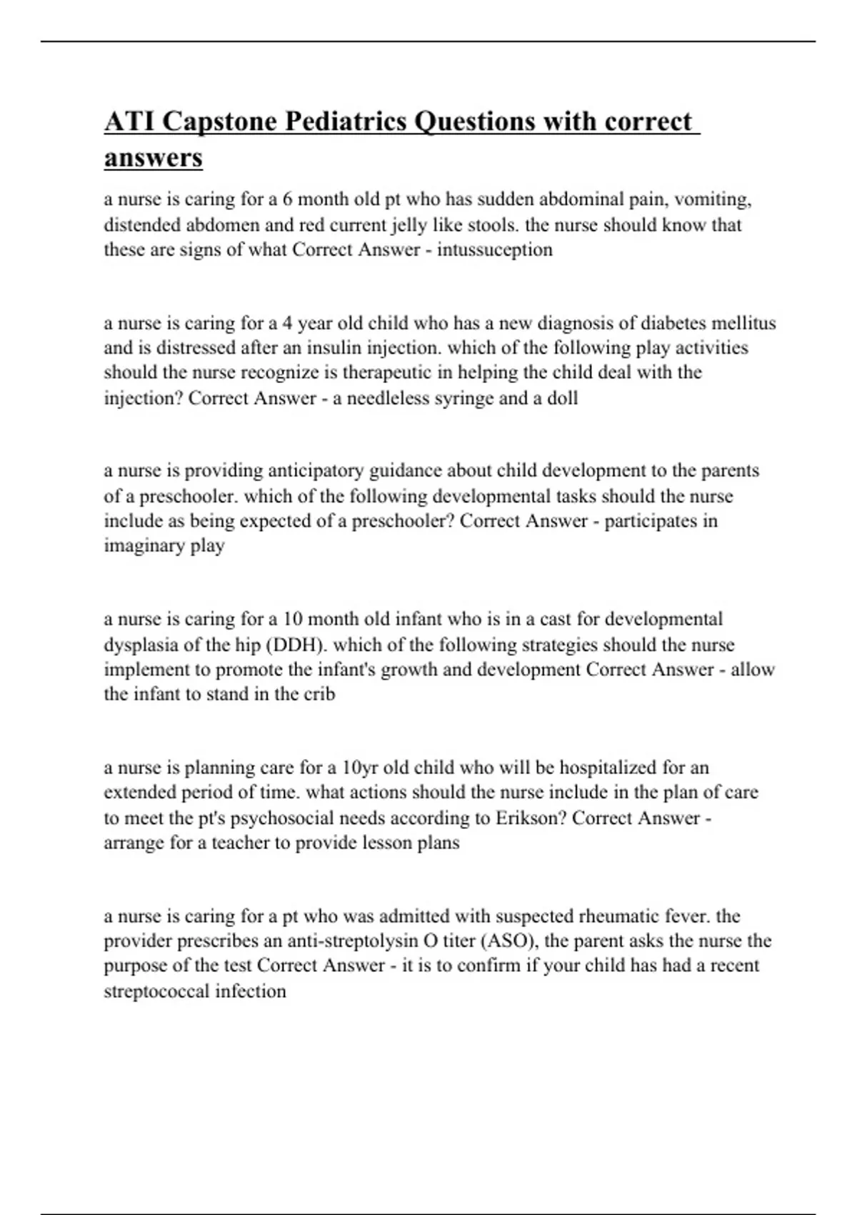 a nurse is caring for a 6 month old pt who has sudden abdominal pain, vomiting, distended abdomen and red current jelly like stools. the nurse should know that these are signs of what Correct Answer - intussuception a nurse is caring for a 4 year old child who has a new diagnosis of diabetes mellitus and is distressed after an insulin injection. which of the following play activities should the nurse recognize is therapeutic in helping the child deal with the injection? Correct Answer - a needleless syringe and a doll a nurse is providing anticipatory guidance about child development to the parents of a preschooler. which of the following developmental tasks should the nurse include as being expected of a preschooler? Correct Answer - participates in imaginary play a nurse is caring for a 10 month old infant who is in a cast for developmental dysplasia of the hip (DDH). which of the following strategies should the nurse implement to promote the infant's growth and development Correct Answer - allow the infant to stand in the crib a nurse is planning care for a 10yr old child who will be hospitalized for an extended period of time. what actions should the nurse include in the plan of care to meet the pt's psychosocial needs according to Erikson? Correct Answer - arrange for a teacher to provide lesson plans a nurse is caring for a pt who was admitted with suspected rheumatic fever. the provider prescribes an anti-streptolysin O titer (ASO), the parent asks the nurse the purpose of the test Correct Answer - it is to confirm if your child has had a recent streptococcal infection