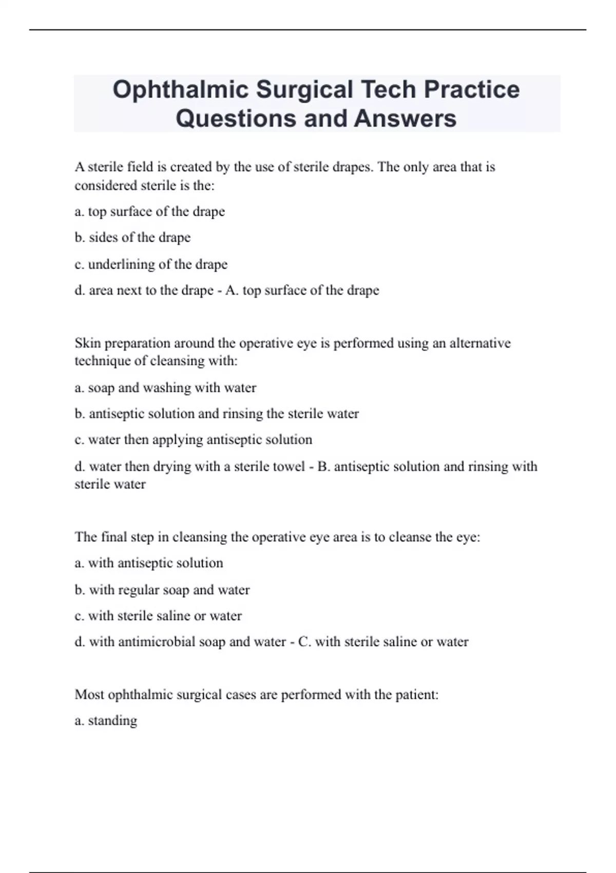 A sterile field is created by the use of sterile drapes. The only area that is considered sterile is the: a. top surface of the drape b. sides of the drape c. underlining of the drape d. area next to the drape - A. top surface of the drape Skin preparation around the operative eye is performed using an alternative technique of cleansing with: a. soap and washing with water b. antiseptic solution and rinsing the sterile water c. water then applying antiseptic solution d. water then drying with a sterile towel - B. antiseptic solution and rinsing with sterile water The final step in cleansing the operative eye area is to cleanse the eye: a. with antiseptic solution b. with regular soap and water c. with sterile saline or water d. with antimicrobial soap and water - C. with sterile saline or water Most ophthalmic surgical cases are performed with the patient: a. standing b. sitting c. on their side d. lying flat on their back - D. lying flat on their back The eye drape should be: a. tight so it does not slip b. snug, but not tight c. removed prior to surgery d. loose for easy removal - B. snug, but not tight Plain surgical gut or catgut is: a. absorbable, eliminating the need for removal b. created from synthetic materials c. available in sizes larger than 6-0 d. not the cause for any post operative reactions - A. absorbable, eliminating the need for removal Nylon sutures: a. irritate tissues b. minimize the growth of bacteria c. are not available in a wide variety of sizes d. are created from natural resources - B. minimize the growth of bacteria Forceps are used to: a. grasp tissues, sutures, and tubing b. cut tissue and sutures c. hold suture needles d. identify muscles and grasp IOL loops - A. grasp tissues, sutures, and tubing