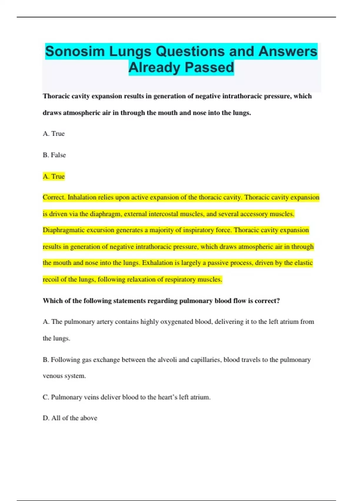 Sonosim Lungs Questions and Answers Already Passed Thoracic cavity expansion results in generation of negative intrathoracic pressure, which draws atmospheric air in through the mouth and nose into the lungs. A. True B. False A. True Correct. Inhalation relies upon active expansion of the thoracic cavity. Thoracic cavity expansion is driven via the diaphragm, external intercostal muscles, and several accessory muscles. Diaphragmatic excursion generates a majority of inspiratory force. Thoracic cavity expansion results in generation of negative intrathoracic pressure, which draws atmospheric air in through the mouth and nose into the lungs. Exhalation is largely a passive process, driven by the elastic recoil of the lungs, following relaxation of respiratory muscles. Which of the following statements regarding pulmonary blood flow is correct? A. The pulmonary artery contains highly oxygenated blood, delivering it to the left atrium from the lungs. B. Following gas exchange between the alveoli and capillaries, blood travels to the pulmonary venous system. C. Pulmonary veins deliver blood to the heart’s left atrium. D. All of the above E. B and C only E. B and C only Correct. In contrast to other arteries in the body, the pulmonary artery delivers deoxygenated blood. The pulmonary artery receives blood from the heart's right ventricle and delivers it to the left and right pulmonary arteries, which progressively branch into smaller and smaller vessels, ending in the capillaries of the alveolar unit. At this point, gas exchange between the alveolus and capillary occurs, and blood then travels to the pulmonary venous system. This venous oxygenated blood travels from the microscopic venules through progressively enlarging vessels, eventually arriving at the pulmonary veins, which deliver blood to the heart's left atrium. Which of the following correctly characterizes the pleura? A. The parietal pleura is adherent to the inner chest wall. B. The visceral pleura is richly innervated with pain fibers and is quite pain sensitive. C. The visceral pleura is the fibrous layer that adheres to the lung parenchyma. D. All of the above E. A and C only E. A and C only Correct. The parietal pleura is the very thin, pain-sensitive fibrous layer that is adherent to the inner aspect of the chest wall. Immediately deep to the parietal pleura lies the insensate visceral pleura, the very thin fibrous layer that is adherent to the lung parenchyma. Within each hemithorax, the lung is bordered by __________. A. the diaphragm B. the chest wall C. the mediastinum