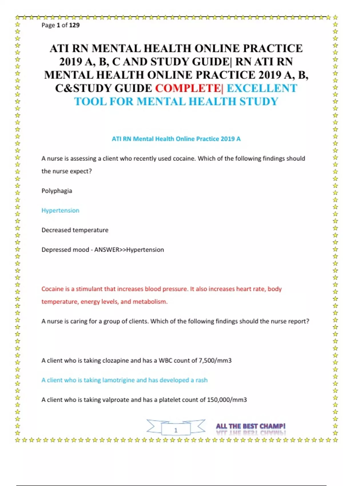 ATI RN MENTAL HEALTH ONLINE PRACTICE 2019 A, B, C AND STUDY GUIDE-RN ATI RN MENTAL HEALTH ONLINE PRACTICE 2019 A, B, C&STUDY GUIDE COMPLETE EXCELLENT TOOL FOR MENTAL HEALTH STUDY
