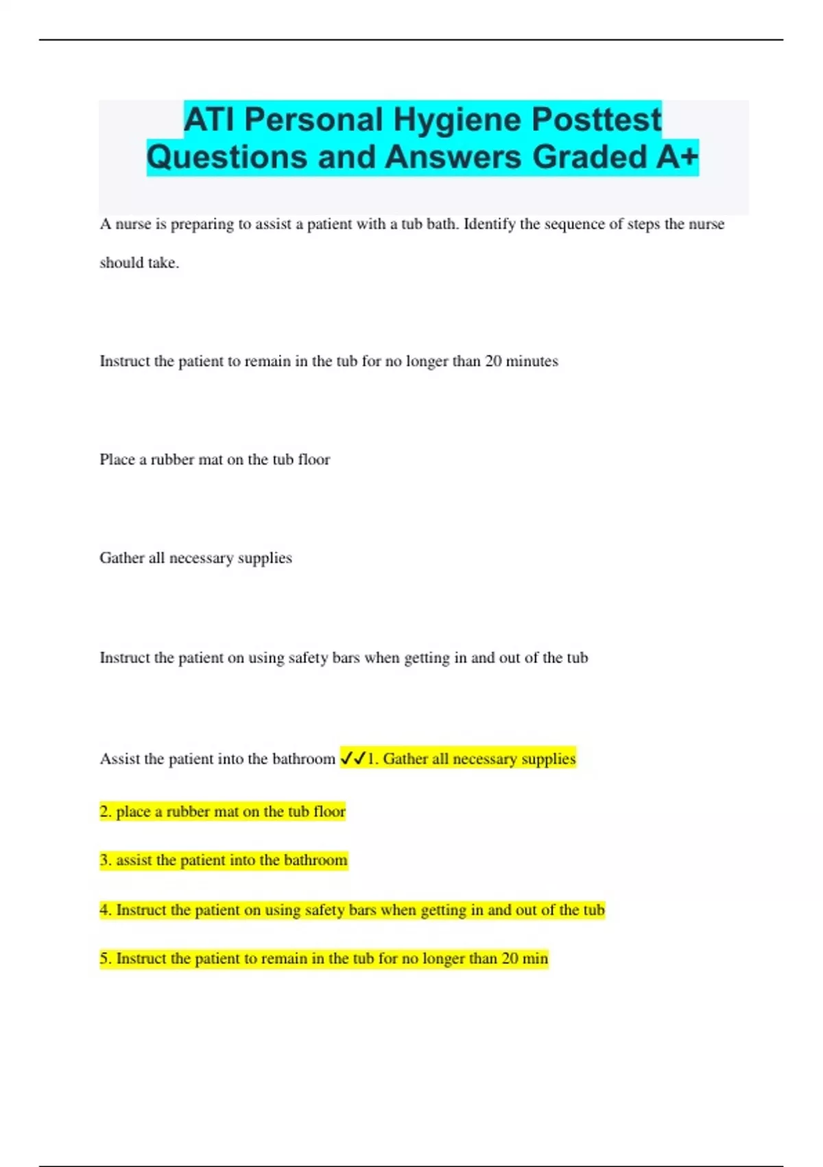 A nurse is preparing to assist a patient with a tub bath. Identify the sequence of steps the nurse should take. Instruct the patient to remain in the tub for no longer than 20 minutes Place a rubber mat on the tub floor Gather all necessary supplies Instruct the patient on using safety bars when getting in and out of the tub Assist the patient into the bathroom 1. Gather all necessary supplies 2. place a rubber mat on the tub floor 3. assist the patient into the bathroom 4. Instruct the patient on using safety bars when getting in and out of the tub 5. Instruct the patient to remain in the tub for no longer than 20 minWhen planning morning hygiene care for a postoperative patient, which of the following actions should the nurse include? A) Inform the patient when morning h