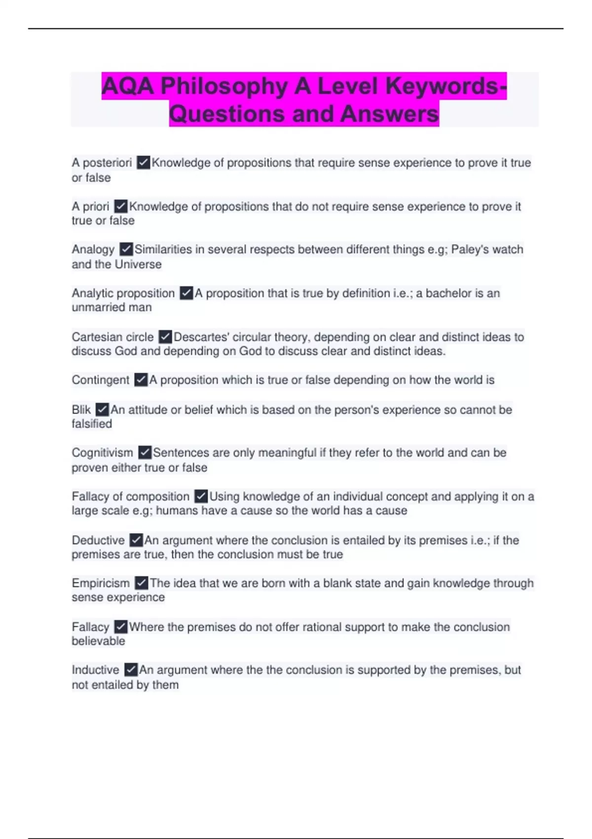 AQA Philosophy A Level Keywords- Questions and Answers