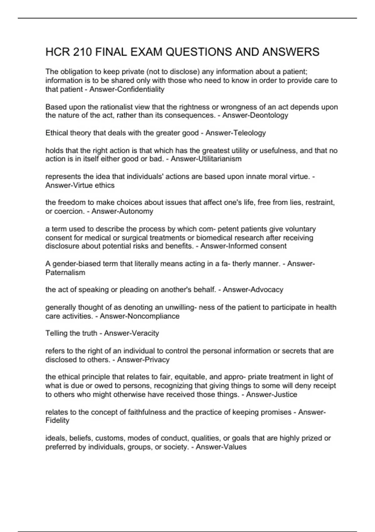 HCR 210 FINAL EXAM QUESTIONS AND ANSWERS