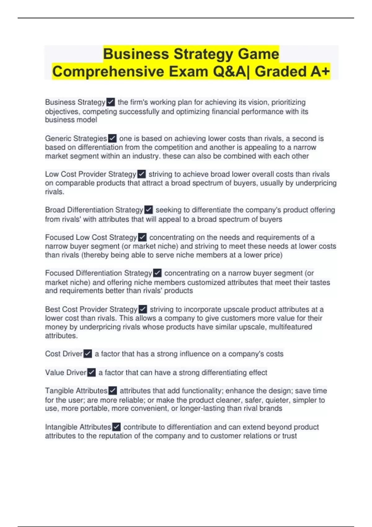 Business Strategy Game Comprehensive Exam Q&A| Graded A+