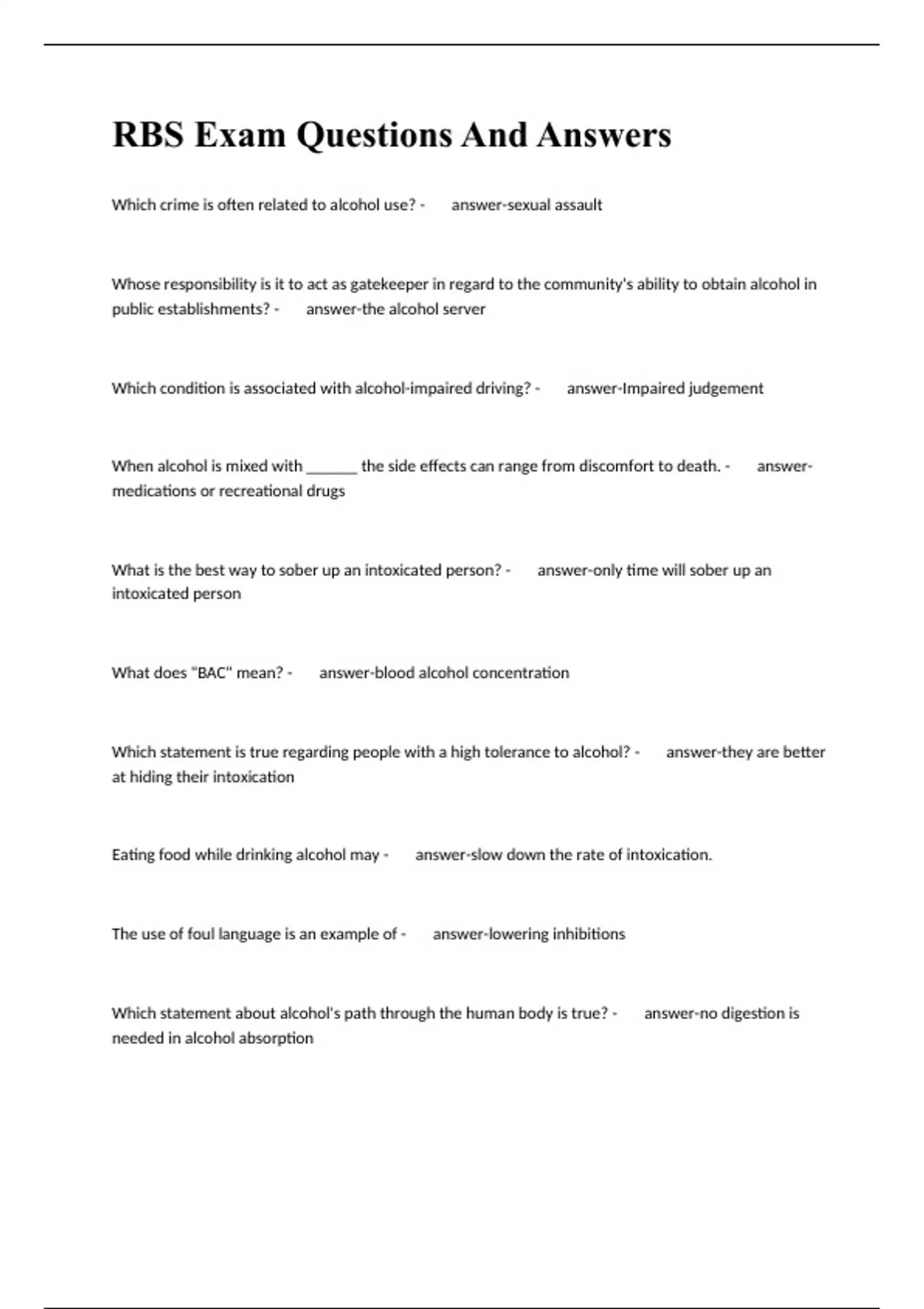Which crime is often related to alcohol use? - answer-sexual assault Whose responsibility is it to act as gatekeeper in regard to the community's ability to obtain alcohol in public establishments? - answer-the alcohol server Which condition is associated with alcohol-impaired driving? - answer-Impaired judgement When alcohol is mixed with ______ the side effects can range from discomfort to death. - answer-medications or recreational drugs What is the best way to sober up an intoxicated person? - answer-only time will sober up an intoxicated person What does "BAC" mean? - answer-blood alcohol concentration Which statement is true regarding people with a high tolerance to alcohol? - answer-they are better at hiding their intoxication Eating food while drinking alcohol may - answer-slow down the rate of intoxication. The use of foul language is an example of - answer-lowering inhibitions Which statement about alcohol's path through the human body is true? - answer-no digestion is needed in alcohol absorption What is the primary purpose of ABC's T.R.A.C.E. program? - answer-identify and investigate where persons under 21 years of age obtained alcohol and who was killed or obtained serious injury or accident It is unlawful for a person who has _____ percent or more, by weight, of alcohol in his/her blood to drive a vehicle. - answer-0.08 bac When can a 19-year old legally serve alcoholic beverages in a restaurant? - answer-when the server's primary responsibilities is to serve food Which type of cannabis use is legal at an onsite alcohol establishment? - answer-use of cannabis products are not permitted in onsite alcohol establishments A non-profit organization has obtained a temporary daily on-sale license for a fundraiser. Who within the organization has to be RBS certified? - answer-the alcohol pourers The failure of a licensee to comply with the RBS program requirements shall be grounds for - answer-disciplinary action.