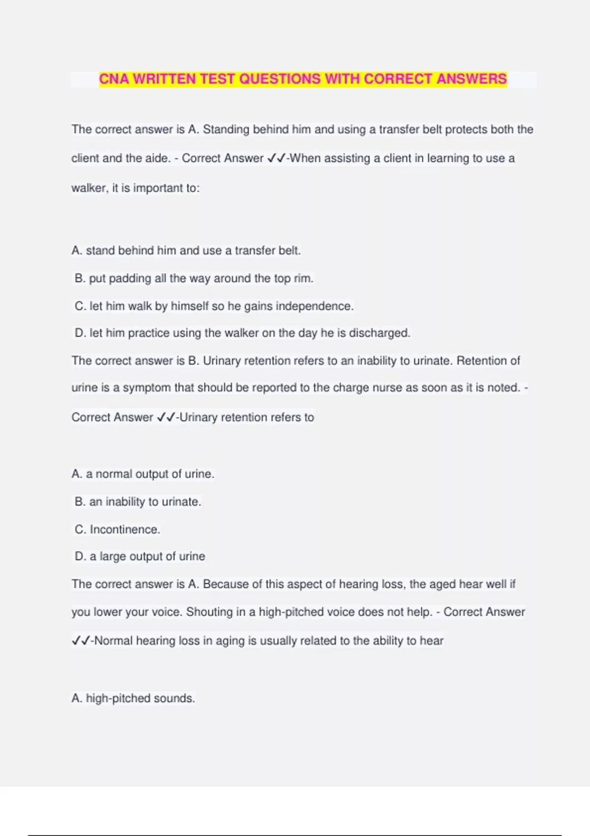 CNA WRITTEN TEST QUESTIONS WITH CORRECT ANSWERS The correct answer is A. Standing behind him and using a transfer belt protects both the client and the aide. - Correct Answer ️️ -When assisting a client in learning to use a walker, it is important to: A. stand behind him and use a transfer belt. B. put padding all the way around the top rim. C. let him walk by himself so he gains independence. D. let him practice using the walker on the day he is discharged. The correct answer is B. Urinary retention refers to an inability to urinate. Retention of urine is a symptom that should be reported to the charge nurse as soon as it is noted. - Correct Answer ️️ -Urinary retention refers to A. a normal output of urine. B. an inability to urinate. C. Incontinence. D. a large output of urine The correct answer is A. Because of this aspect of hearing loss, the aged hear well if you lower your voice. Shouting in a high-pitched voice does not help. - Correct Answer ️️ -Normal hearing loss in aging is usually related to the ability to hear A. high-pitched sounds. B. loud sounds. C. all sounds. D. rapid speech. The correct answer is D. A confused patient may answer to any name or lie down in any bed. - Correct Answer ️️ -The best way to safely identify your patient is by A. asking his name. B. calling his name and waiting for his response. C. checking the bed plate. D. checking the name tag The correct answer is A. The nurse aide should report it to the charge nurse. Nurse aides cannot order a procedure or increase fluids. Anything unusual must be reported to the nurse in charge. - Correct Answer ️️ -Mrs. Jones is on a bowel and bladder training program. She has not had a bowel movement for three days. What should the nurse aide do? A. Report it to the charge nurse. B. Give the patient an enema. C. Offer prune juice. D. Increase fluids. The correct answer is C. The proper medical abbreviation for before meals is a.c. - Correct Answer ️️ -The proper medical abbreviation for before meals is A. p.c. B. b.i.d. C. a.c. D. t.i.d. The correct answer is B. The proper medical term for high blood pressure is hypertension - Correct Answer ️️ -The proper medical term for high blood pressure is A. diabetes. B. hypertension. C. hypotension. D. CVA. The correct answer is D. A mechanical soft diet is easy to chew, swallow, and digest. - Correct Answer ️️ -A patient who has difficulty chewing or swallowing will need what type of diet? A. clear liquid B. low residue C. bland D. mechanical soft The correct answer is C. Helping her locate her room on her own would make Ms. Lee feel better about herself. - Correct Answer ️️ -Mrs Smith is an 81-year-old resident with Alzheimer's disease and cannot find her room. What should the nurse aide do to help Mrs Smith feel more independent? A. Scold her and tell her to stay in the room. B. Ask her roommate to watch her. C. Place a familiar object outside her room door. D. Write the room number on a piece of paper. The correct answer is A. Input and output are totaled once per shift as well as every 24 hours - Correct Answer ️️ -How often should a patient's intake and output records be totaled? A. once each shift B. twice a day C. every four hours D. every 12 hours The correct answer is C. Failure to notice bruises or marks on the ski