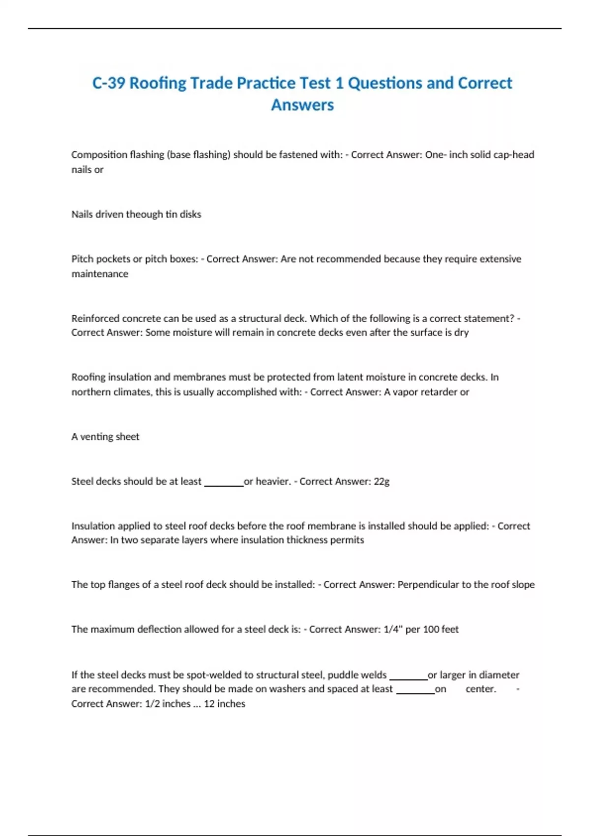 C-39 Roofing Trade Practice Test 1 Questions and Correct Answers Composition flashing (base flashing) should be fastened with: - Correct Answer: One- inch solid cap-head nails or Nails driven theough tin disks