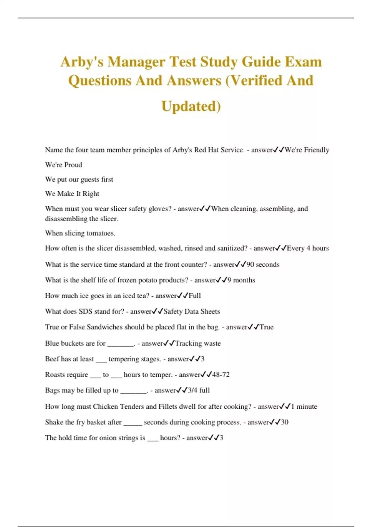 Arby's Manager Test Study Guide Exam Questions And Answers (Verified And Updated) Name the four team member principles of Arby's Red Hat Service. - answerWe're Friendly We're Proud We put our guests first We Make It Right When must you wear slicer safety gloves? - answerWhen cleaning, assembling, and disassembling the slicer. When slicing tomatoes. How often is the slicer disassembled, washed, rinsed and sanitized? - answerEvery 4 hours What is the service time standard at the front counter? - answer90 seconds What is the shelf life of frozen potato products? - answer9 months How much ice goes in an iced tea? - answerFull What does SDS stand for? - answerSafety Data Sheets