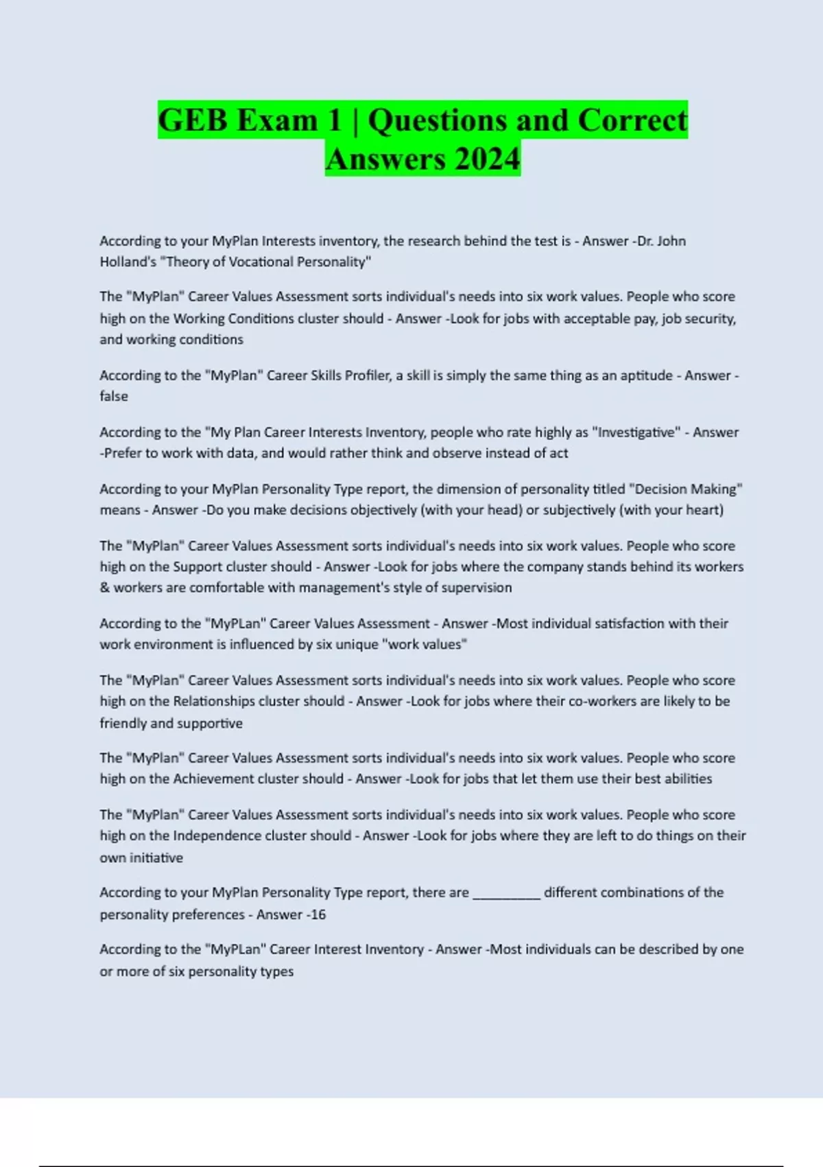 GEB Exam 1 | Questions and Correct Answers 2024 According to your MyPlan Interests inventory, the research behind the test is - Answer -Dr. John Holland's "Theory of Vocational Personality" The "MyPlan" Career Values Assessment sorts individual's needs into six work values. People who score high on the Working Conditions cluster should - Answer -Look for jobs with acceptable pay, job security, and working conditions According to the "MyPlan" Career Skills Profiler, a skill is simply the same thing as an aptitude - Answer - false According to the "My Plan Career Interests Inventory, people who rate highly as "Investigative" - Answer -Prefer to work with data, and would rather think and observe instead of act According to your MyPlan Personality Type report, the dimension of personality titled "Decision Making" means - Answer -Do you make decisions objectively (with your head) or subjectively (with your heart) The "MyPlan" Career Values Assessment sorts individual's needs into six work values. People who score high on the Support cluster should - Answer -Look for jobs where the company stands behind its workers & workers are comfortable with management's style of supervision According to the "MyPLan" Career Values Assessment - Answer -Most individual satisfaction with their work environment is influenced by six unique "work values" The "MyPlan" Career Values Assessment sorts individual's needs into six work values. People who score high on the Relationships cluster should - Answer -Look for jobs where their co-workers are likely to be friendly and supportive The "MyPlan" Career Values Assessment sorts individual's needs into six work values. People who score high on the Achievement cluster should - Answer -Look for jobs that let them use their best abilities The "MyPlan" Career Values Assessment sorts individual's needs into six work values. People who score high on the Independence cluster should - Answer -Look for jobs where they are left to do things on their own initiative According to your MyPlan Personality Type report, there are _________ different combinations of the personality preferences - Answer -16 According to the "MyPLan" Career Interest Inventory - Answer -Most individuals can be described by one or more of six personality types