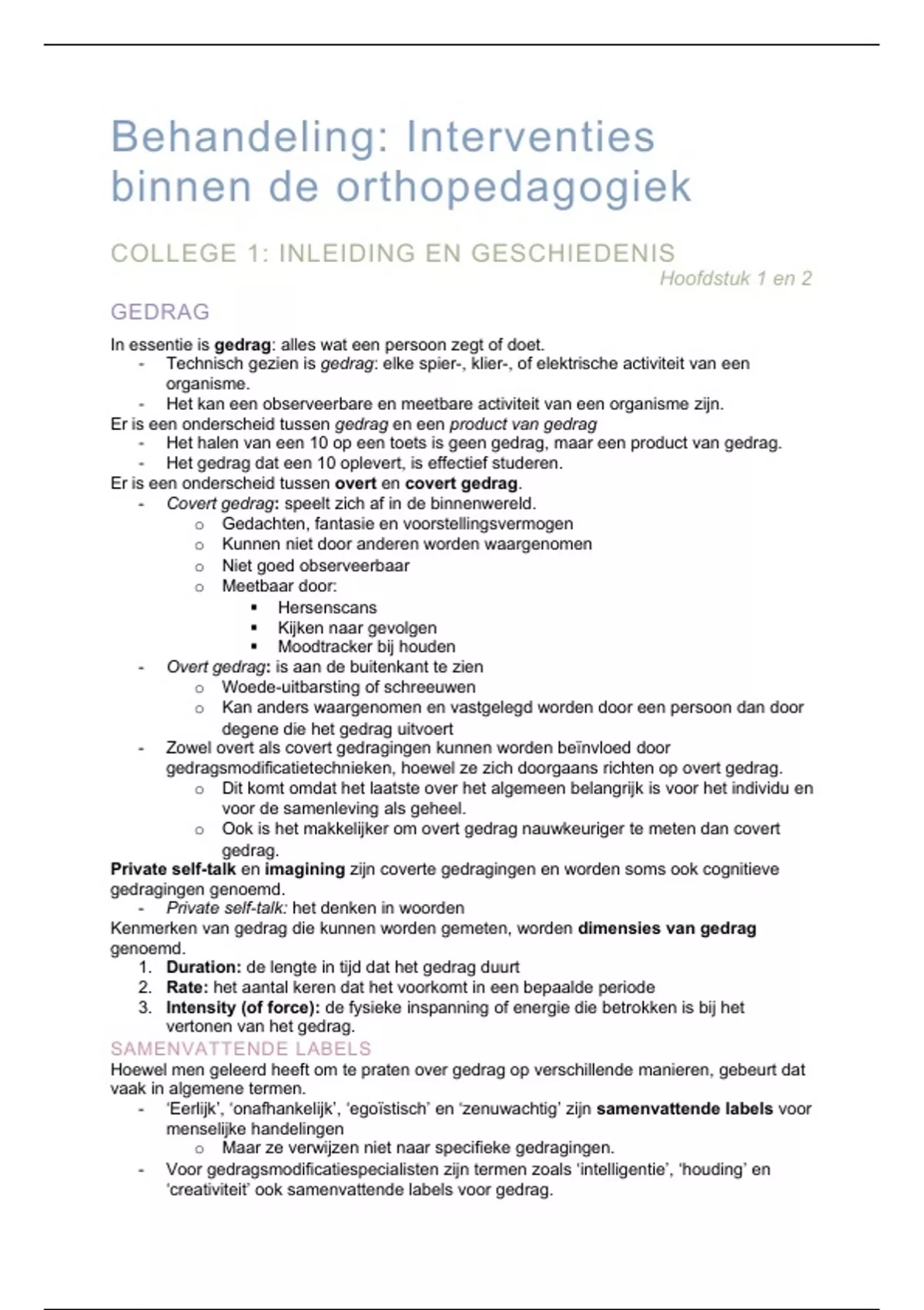 Uitgebreide sammenvatting van college 1 tot en met 4 van het vak behandeling: interventies binnen de Pedagogiek. De volgende colleges worden later nog toe gevoegd. Einde van document korte oefentoets.