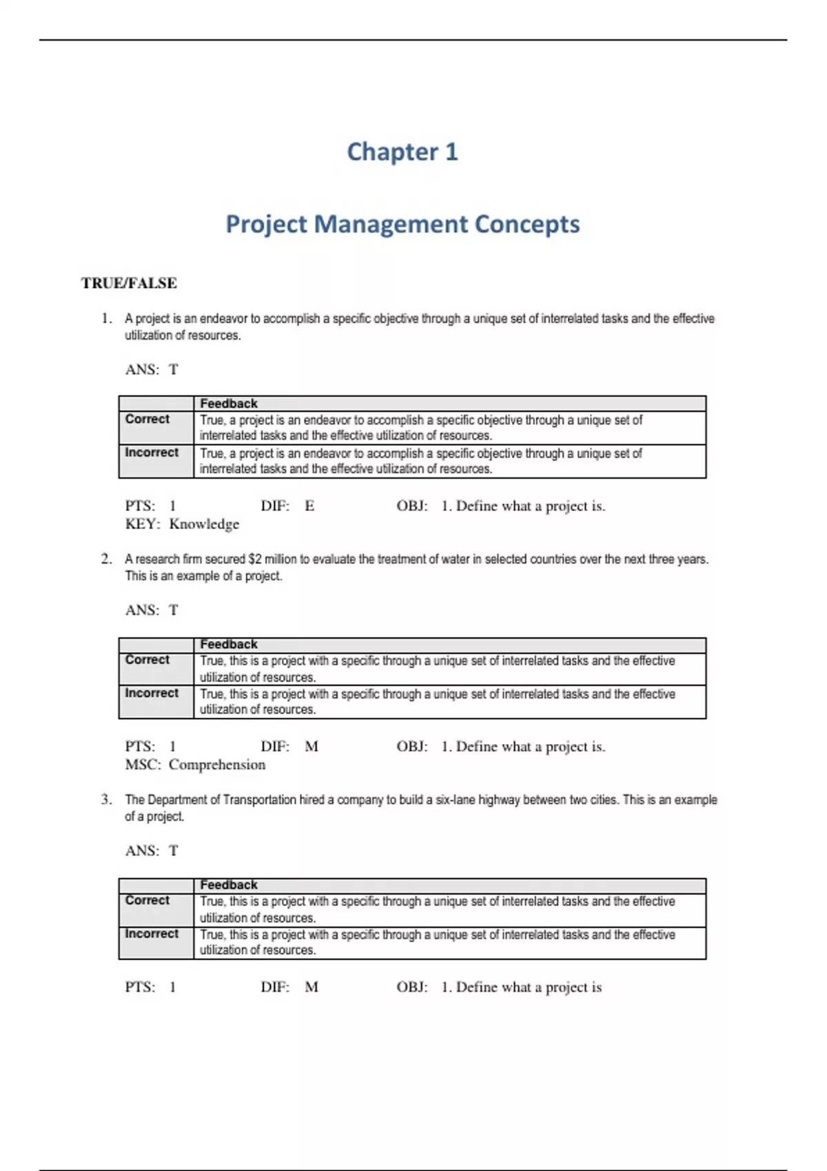 Incorrect True, a project is an endeavor to accomplish a specific objective through a unique set of