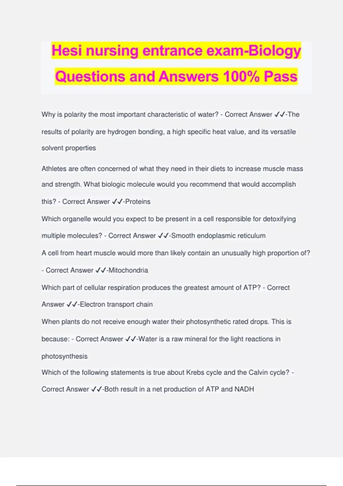 Hesi nursing entrance exam-Biology Questions and Answers 100% Pass Why is polarity the most important characteristic of water? - Correct Answer ️️ -The results of polarity are hydrogen bonding, a high specific heat value, and its versatile solvent properties Athletes are often concerned of what they need in their diets to increase muscle mass and strength. What biologic molecule would you recommend that would accomplish this? - Correct Answer ️️ -Proteins Which organelle would you expect to be present in a cell responsible for detoxifying multiple molecules? - Correct Answer ️️ -Smooth endoplasmic reticulum A cell from heart muscle would more than likely contain an unusually high proportion of? - Correct Answer ️️ -Mitochondria Which part of cellular respiration produces the greatest amount of ATP? - Correct Answer ️️ -Electron transport chain When plants do not receive enough water their photosynthetic rated drops. This is because: - Correct Answer ️️ -Water is a raw mineral for the light reactions in photosynthesis Which of the following statements is true about Krebs cycle and the Calvin cycle? - Correct Answer ️️ -Both result in a net production of ATP and NADH Why is it important for cells to undergo mitosis? - Correct Answer ️️ -Mitosis produces cells for growth and repair of body tissue 72 chromosomes undergo meiosis. How many chromosomes will be in each gamete? - Correct Answer ️️ -36 Which of the following shows how information is transformed to make a protein? - Correct Answer ️️ -DNA-RNA-Protein Alleles - Correct Answer ️️ -alternate version of a gene Amino Acids - Correct Answer ️️ -organic compounds that contain at least one amino group and a carboxyl group Binary Fission - Correct Answer ️️ -type of assexual reproduction Chromosomes - Correct Answer ️️ -compact rod shaped body located in the nucleous of a cell. Contains DNA Codon - Correct Answer ️️ -3 base sequence of messenger RNA Cytokinesis - Correct Answer ️️ -... Deoxyribonucleic acid (DNA) - Correct Answer ️️ -a unique mol