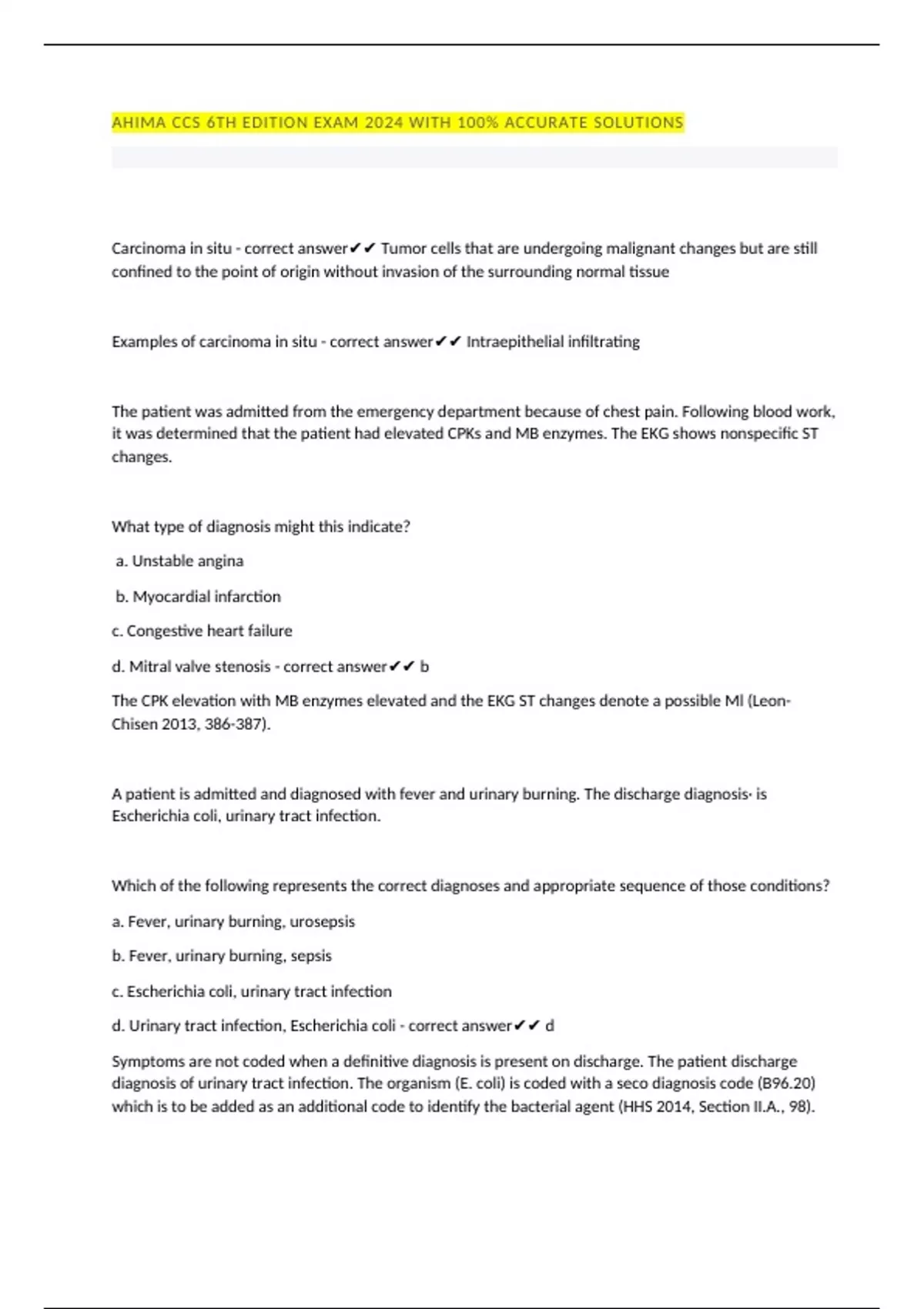 AHIMA CCS 6TH EDITION EXAM 2024 WITH 100% ACCURATE SOLUTIONS Carcinoma in situ - correct answer Tumor cells that are undergoing malignant changes but are still confined to the point of origin without invasion of the surrounding normal tissue Examples of carcinoma in situ - correct answer Intraepithelial infiltrating The patient was admitted from the emergency department because of chest pain. Following blood work, it was determined that the patient had elevated CPKs and MB enzymes. The EKG shows nonspecific ST changes. What type of diagnosis might this indicate? a. Unstable angina b. Myocardial infarction c. Congestive heart failure d. Mitral valve stenosis - correct answer b The CPK elevation with MB enzymes elevated and the EKG ST changes denote a possible Ml (Leon-Chisen 2013, 386-387). A patient is admitted and diagnosed with fever and urinary burning. The discharge diagnosis· is Esc
