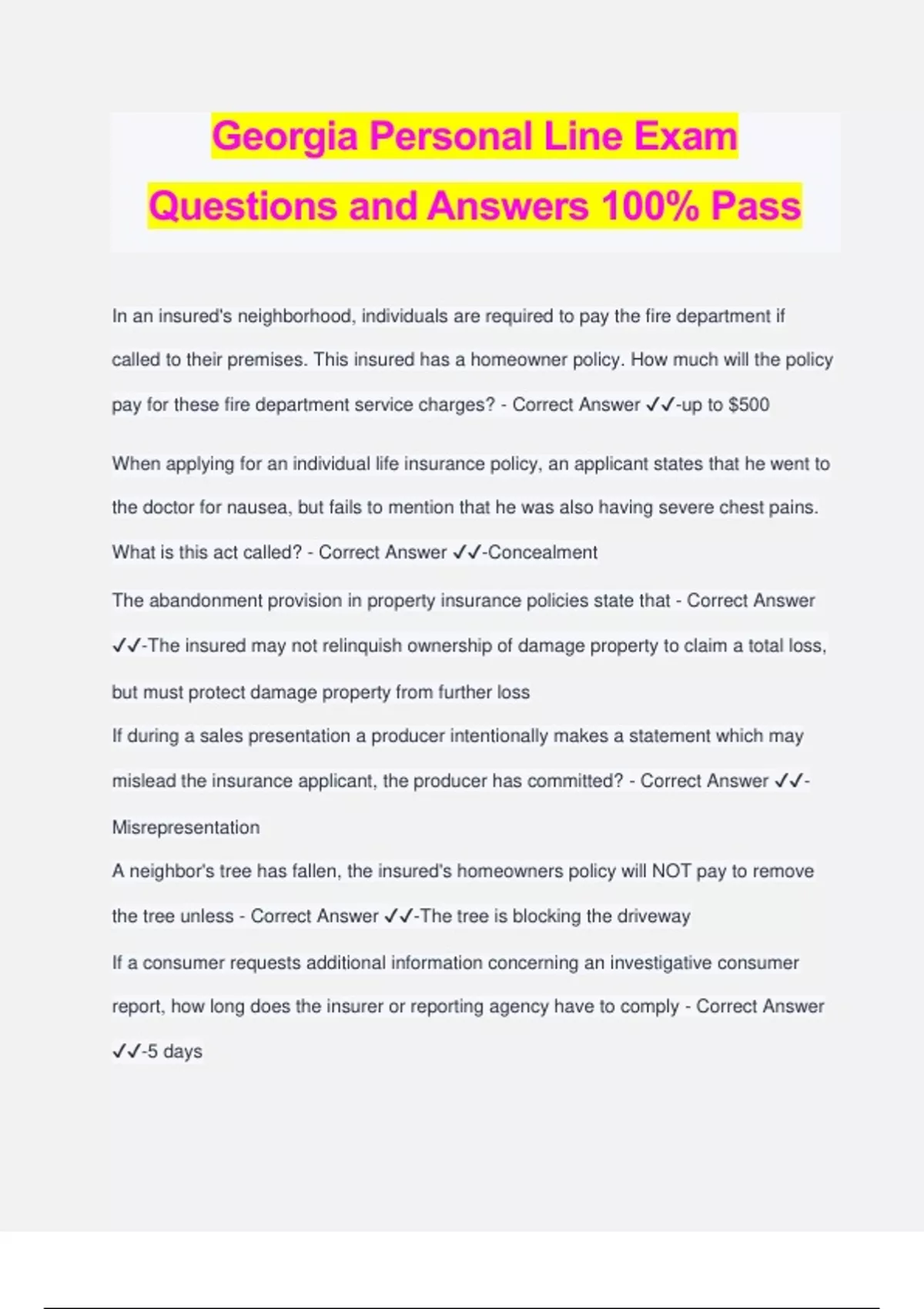 Georgia Personal Line Exam Questions and Answers 100% Pass In an insured's neighborhood, individuals are required to pay the fire department if called to their premises. This insured has a homeowner policy. How much will the policy pay for these fire department service charges? - Correct Answer ️️ -up to $500 When applying for an individual life insurance policy, an applicant states that he went to the doctor for nausea, but fails to mention that he was also having severe chest pains. What is this act called? - Correct Answer ️️ -Concealment The abandonment provision in property insurance policies state that - Correct Answer ️️ -The insured may not relinquish ownership of damage property to claim a total loss, but must protect damage property from further loss If during a sales presentation a producer intentionally makes a statement which may mislead the insurance applicant, the producer has committed? - Correct Answer ️️ - Misrepresentation A neighbor's tree has fallen, the insured's homeowners policy will NOT pay to remove the tree unless - Correct Answer ️️ -The tree is blocking the driveway If a consumer requests additional information concerning an investigative consumer report, how long does the insurer or reporting agency have to comply - Correct Answer ️️ -5 days