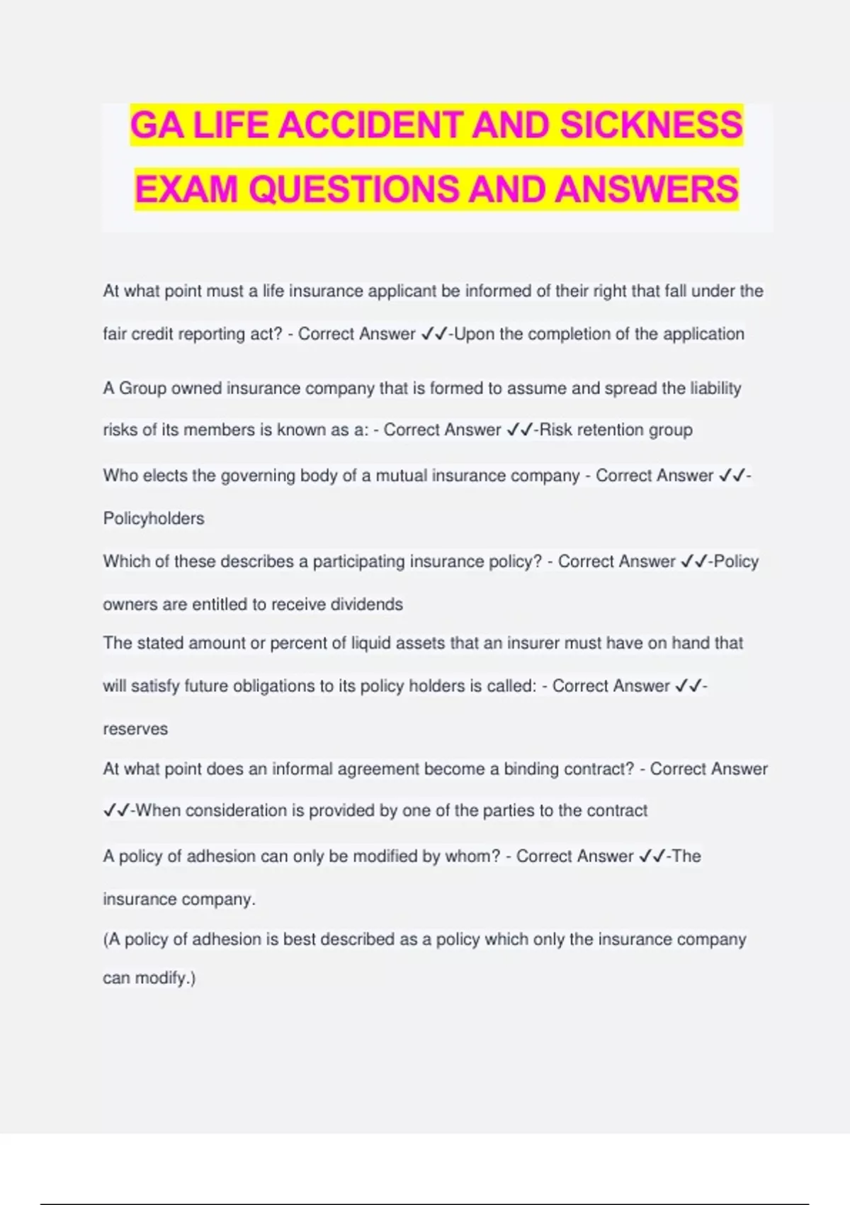 originated life insurance (or STOLI) is used to circumvent state insurable interest statutes. This is done when an investor (or stranger) persuades an individual to take out life insurance specifically for the purpose of selling the policy to the investor. The investor compensates the insured and makes the premiums, then collects the death benefit when the insured dies. A contract where one party either except or reject the terms of a contract written by another party is called a contract of - Correct Answer ✔️✔️-Adhesion Insurance contracts are known as___because certain future conditions or ask must occur before any claims can be paid - Correct Answer ✔️✔️-Conditional In regards to representations or warranties, which of these statements is TRUE? - Correct Answer ✔️✔️-If material to the risk, false representations will void a policy Which of these is not considered to be an element of an insurance contract? - Correct Answer ✔️✔️-negotiating Insurance policies are offered on a take it or leave it bases, which make them - Correct Answer ✔️✔️-Contracts of adhesion Statements made on insurance app lication that are believed to be true to the best of the applicants knowledge are called - Correct Answer ✔️✔️-representations P owns a $25,000 Life Policy that pays the face amount to him if he lives to age 70, or to his beneficiary if he dies before age 70. What kind of policy does P own? - Correct Answer ✔️✔️-Endowment at age 70 Credit Life Insurance is - Correct Answer ✔️✔️-issued in an amount not to exceed the amount of the loan Which of the following information is not required to be included in a who le life policy? - Correct Answer ✔️✔️-Policy's guaranteed dividend table