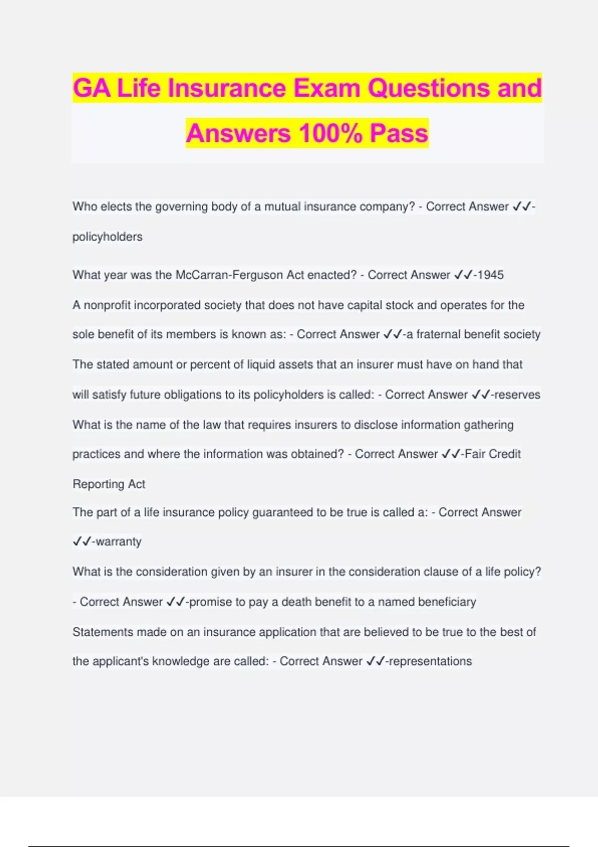 GA Life Insurance Exam Questions and Answers 100% Pass Who elects the governing body of a mutual insurance company? - Correct Answer ️️ - policyholders What year was the McCarran-Ferguson Act enacted? - Correct Answer ️️ -1945 A nonprofit incorporated society that does not have capital stock and operates for the sole benefit of its members is known as: - Correct Answer ️️ -a fraternal benefit society The stated amount or percent of liquid assets that an insurer must have on hand that will satisfy future obligations to its policyholders is called: - Correct Answer ️️ -reserves What is the name of the law that requires insurers to disclose information gathering practices and where the information was obtained? - Correct Answer ️️ -Fair Credit Reporting Act The part of a life insurance policy guaranteed to be true is called a: - Correct Answer ️️ -warranty What is the consideration given by an insurer in the consideration clause of a life policy? - Correct Answer ️️ -promise to pay a death benefit to a named beneficiary Statements made on an insurance application that are believed to be true to the best of the applicant's knowledge are called: - Correct Answer ️️ -representations Which of the following consists of an offer, acceptance, and consideration? - Correct Answer ️️ -contract Which of these require an offer, acceptance, and consideration? - Correct Answer ️️ - contract In regards to representation or warranties, which of these statements is TRUE? - Correct Answer ️️ -If material to the risk, false representation will void a policy Insurance policies are offered on a "take it or leave it" basis, which make them: - Correct Answer ️️ -Contracts of Adhesion A life insurance policy would be considered a wagering contract WITHOUT: - Correct Answer ️️ -insurable interest Insurance policies are considered aleatory contracts because - Correct Answer ️️ - performance is conditioned upon a future occurance Life and health insurance policies are: - Correct Answer ️️ -Unilateral contracts Who makes the legally enforceable promises in a unilateral contract? - Correct Answer ️️ -insurance company When must insurable interest be present in order for a life insurance policy to be valid? - Correct Answer ️️ -when the application is made Which of these is NOT a type of agent authority - Correct Answer ️️ -principal When third-party ownership is involved, applicants who also happen to be the stated primary beneficiary are required to have: - Correct Answer ️️ -insurable interest in the proposed insured What kind of life insurance policy pays a specified monthly income to a beneficiary for 30 years and then pays a lump sum benefit at the end of that 30 years? - Correct Answer ️️ -family maintenance policy When is the face amount paid under a Joint Life and Survivor policy? - Correct Answer ️️ -upon the death of the insured A 15-year mortgage is best protected by what kind of life policy? - Correct Answer ️️ - 15-year decreasing term A term life insurance policy matures: - Correct Answer ️️ -upon the insured's death during the term of the policy The amount of coverage on a group credit life policy is limited to: - Correct Answer ️️ - the insured's total loan value Which statement is TRUE regarding a Variable Whole Life policy? - Correct Answer ️️ -a minimum guaranteed Death benefit is provided Life insurance that covers an insured's whole life with level premiums paid over a limited time is called: - Correct Answer ️️ -limited pay life Which of the following characteristics is CORRECT about Interest Sensitive Whole Life? - Correct Answer ️️ -premium payments can vary What kind of life insurance product covers children under their parent's p