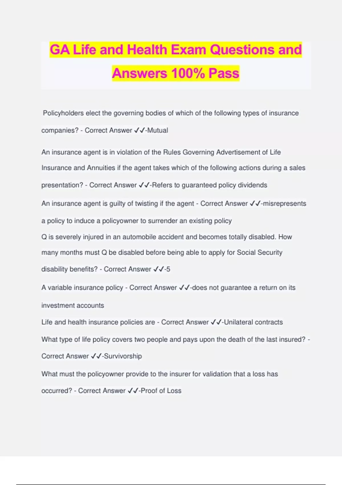 GA Life and Health Exam Questions and Answers 100% Pass Policyholders elect the governing bodies of which of the following types of insurance companies? - Correct Answer ️️ -Mutual An insurance agent is in violation of the Rules Governing Advertisement of Life Insurance and Annuities if the agent takes which of the following actions during a sales presentation? - Correct Answer ️️ -Refers to guaranteed policy dividends An insurance agent is guilty of twisting if the agent - Correct Answer ️️ -misrepresents a policy to induce a policyowner to surrender an existing policy Q is severely injured in an automobile accident and becomes totally disabled. How many months must Q be disabled before being able to apply for Social Security disability benefits? - Correct Answer ️️ -5 A variable insurance policy - Correct Answer ️️ -does not guarantee a return on its investment accounts Life and health insurance policies are - Correct Answer ️️ -Unilateral contracts What type of life policy covers two people and pays upon the death of the last insured? - Correct Answer ️️ -Survivorship What must the policyowner provide to the insurer for validation that a loss has occurred? - Correct Answer ️️ -Proof of Loss Additional coverage can be added to a Whole Life policy by adding a(n) - Correct Answer ️️ -decreasing term rider Which of these is NOT relevant when determining the amount of personal life insurance needed? - Correct Answer ️️ -Local unemployment rate An annuity promises that, if the annuitant dies before receiving payments equal to the correct value, the payments will be continued to a beneficiary until an amount equal to the contract value has been paid. This type of annuity is called - Correct Answer ️️ -An installment Refund annuity Which of the following health insurance policy provisions specifies the health care services a policy will provide? - Correct Answer ️️ -Insuring clause Which of these types of coverage is best described as a short term medical policy? - Correct Answer ️️ -interim coverage On an Accidental Death and Dismemberment (AD&D) insurance policy, who is qualified to change the beneficiary designation? - Correct Answer ️️ -Policyowner Which of the following organizations would make reimbursement payments directly to the insured individual for covered medical expenditures? - Correct Answer ️️ - Commercial insurer L takes out a life insurance policy and dies 10 years later. During the claim process, the insurer discovers that L had understated her age on the application. Under the Misstatement of Age provision, the insurer will - Correct Answer ️️ -adjust the death benefit to a reduced amount A level premium indicates - Correct Answer ️️ -the premium is fixed for the entire duration of the contract What benefit does the Payor clause on a Juvenile Life policy provide? - Correct Answer ️️ -Premiums are waived if payor becomes disabled The insuring clause - Correct Answer ️️ -States the scope and limits of the coverage The Replacement of Life Insurance and Annuities regulation is designed to protect the interest of the - Correct Answer ️️ -policyowner Long Term Care policies will usually pay for eligible benefits using which o