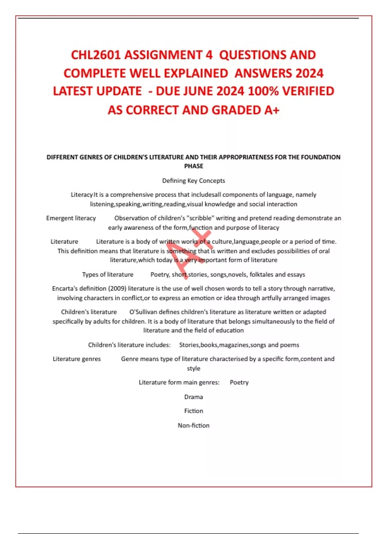 CHL2601 ASSIGNMENT 4 QUESTIONS AND COMPLETE WELL EXPLAINED ANSWERS 2024 LATEST UPDATE - DUE JUNE 2024 100% VERIFIED AS CORRECT AND GRADED A+ DIFFERENT GENRES OF CHILDREN'S LITERATURE AND THEIR APPROPRIATENESS FOR THE FOUNDATION PHASE Defining Key Concepts Literacy It is a comprehensive process that includesall components of language, namely listening,speaking,writing,reading,visual knowledge and social interaction Emergent literacy Observation of children's "scribble" writing and pretend reading demonstrate an early awareness of the form,function and purpose of literacy Literature Literature is a body of written works of a culture,language,people or a period of time. This definition means that literature is something that is written and excludes possibilities of oral literature,which today is a very important form of literature Types of literature Poetry, short stories, songs,novels, folktales and essays Encarta's definition (2009) literature is the use of well chosen words to tell a story through narrative, involving characters in conflict,or to express an emotion or idea through artfully arranged images Children's literature O'Sullivan defines children's literature as literature written or adapted specifically by adults for children. It is a body of literature that belongs simultaneously to the field of literature and the field of education Children's literature includes: Stories,books,magazines,songs and poems Literature genres Genre means type of literature characterised by a specific form,content and style Literature form main genres: Poetry Drama Fiction Non-f