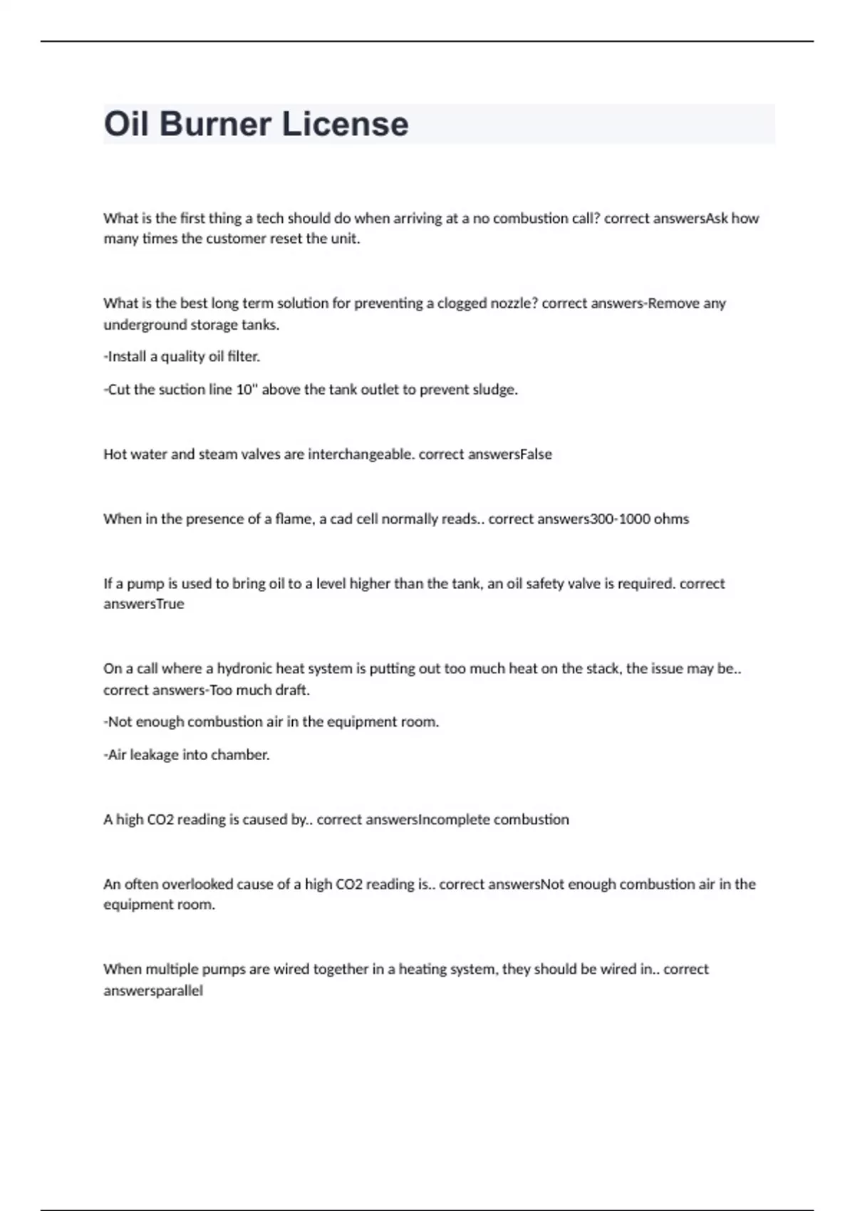 What is the first thing a tech should do when arriving at a no combustion call? correct answersAsk how many times the customer reset the unit. What is the best long term solution for preventing a clogged nozzle? correct answers-Remove any underground storage tanks. -Install a quality oil filter. -Cut the suction line 10" above the tank outlet to prevent sludge. Hot water and steam valves are interchangeable. correct answersFalse When in the presence of a flame, a cad cell normally reads.. correct answers300-1000 ohms If a pump is used to bring oil to a level higher than the tank, an oil safety valve is required. correct answersTrue On a call where a hydronic heat system is putting out too much heat on the stack, the issue may be.. correct answers-Too much draft. -Not enough combustion air in the equipment room. -Air leakage into chamber. A high CO2 reading is caused by.. correct answersIncomplete combustion An often overlooked cause of a high CO2 reading is.. correct answersNot enough combustion air in the equipment room. When multiple pumps are wired together in a heating system, they should be wired in.. correct answersparallel