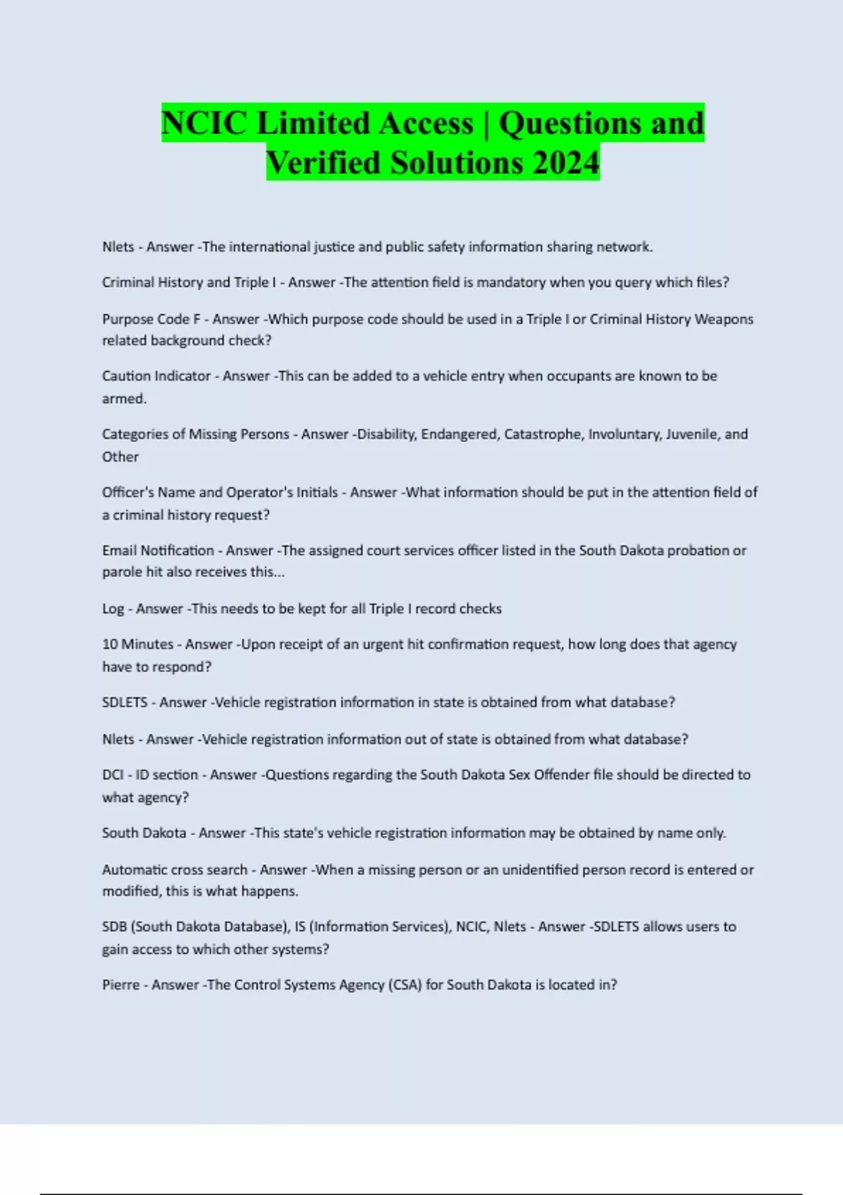NCIC Limited Access | Questions and Verified Solutions 2024 Nlets - Answer -The international justice and public safety information sharing network. Criminal History and Triple I - Answer -The attention field is mandatory when you query which files? Purpose Code F - Answer -Which purpose code should be used in a Triple I or Criminal History Weapons related background check? Caution Indicator - Answer -This can be added to a vehicle entry when occupants are known to be armed. Categories of Missing Persons - Answer -Disability, Endangered, Catastrophe, Involuntary, Juvenile, and Other Officer's Name and Operator's Initials - Answer -What information should be put in the attention field of a criminal history request? Email Notification - Answer -The assigned court services officer listed in the South Dakota probation or parole hit also receives this... Log - Answer -This needs to be kept for all Triple I record check