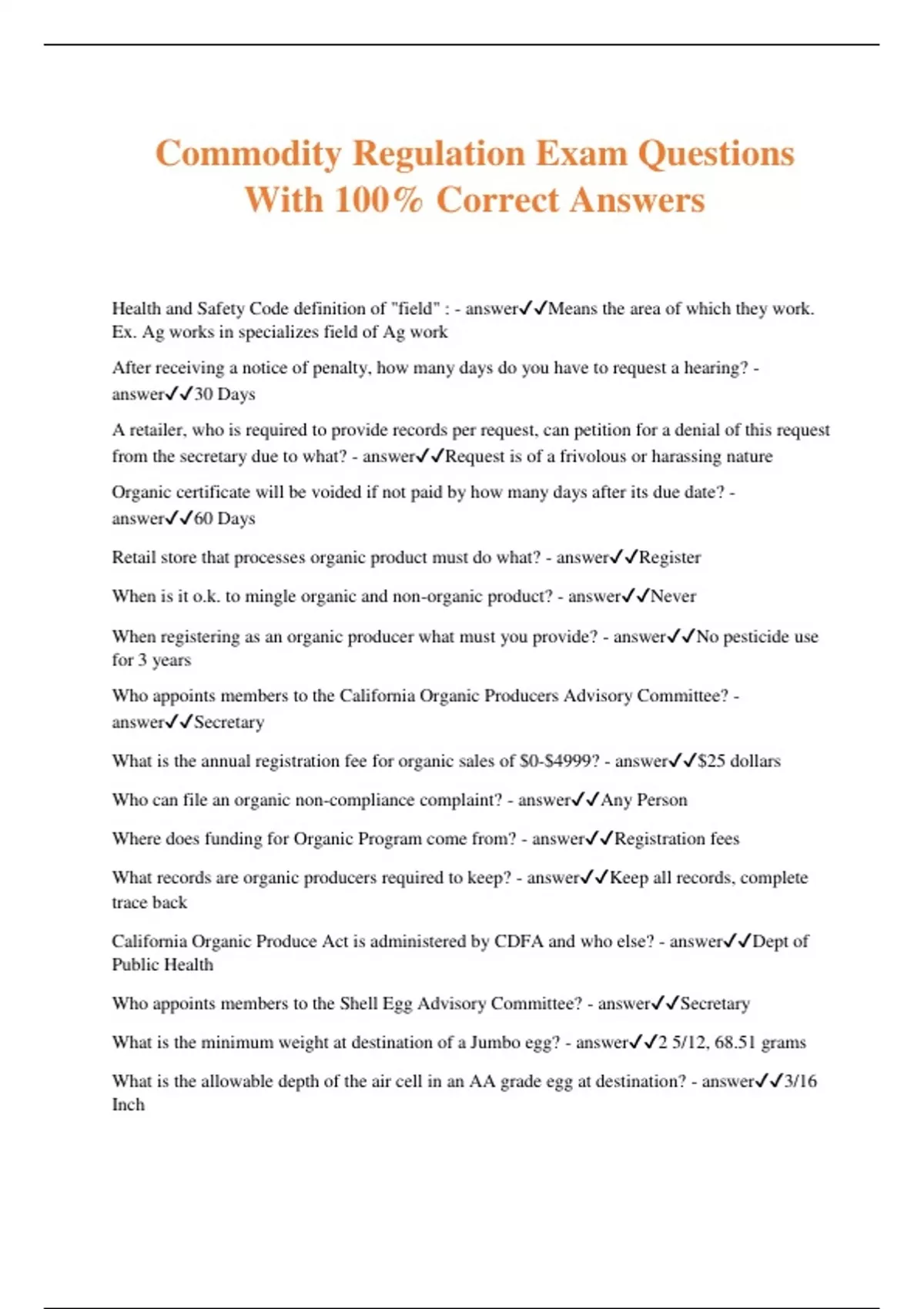 Commodity Regulation Exam Questions With 100% Correct Answers Health and Safety Code definition of "field" : - answerMeans the area of which they work. Ex. Ag works in specializes field of Ag work After receiving a notice of penalty, how many days do you have to request a hearing? - answer30 Days A retailer, who is required to provide records per request, can petition for a denial of this request from the secretary due to what? - answerRequest is of a frivolous or harassing nature Organic certificate will be voided if not paid by how many days after its due date? - answer60 Days Retail store that processes organic product must do what? - answerRegister When is it o.k. to mingle organic and non-organic product? - answerNever When registering as an organic producer what must you provide? - answerNo pesticide use for 3 years Who appoints members to the California Organic Producers Advisory Committee? - answerSecretary What is the annual registration fee for organic sales of $0-$4999? - answer$25 dollars Who can file an organic non-compliance complaint? - answerAny Person Where does funding for Organic Program come from? - answerRegistration fees What records are organic producers required to keep? - answerKeep all records, complete trace back California Organic Produce Act is administered by CDFA and who else? - answerDept of Public Health Who appoints members to the Shell Egg Advisory Committee? - answerSecretary What is the minimum weight at destination of a Jumbo egg? - answer2 5/12, 68.51 grams What is the allowable depth of the air cell in an AA grade egg at destination? - answer3/16 Inch