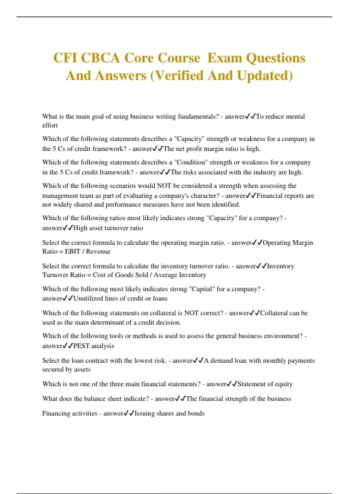 CFI CBCA Core Course Exam Questions And Answers (Verified And Updated) What is the main goal of using business writing fundamentals? - answerTo reduce mental effort Which of the following statements describes a "Capacity" strength or weakness for a company in the 5 Cs of credit framework? - answerThe net profit margin ratio is high. Which of the following statements describes a "Condition" strength or weakness for a company in the 5 Cs of credit framework? - answerThe risks associated with the industry are high. Which of the following scenarios would NOT be considered a strength when assessing the management team as part of evaluating a company's character? - answerFinancial reports are not widely shared and performance measures have not been identified. Which of the following ratios most likely indicates strong "Capacity" for a company? - answerHigh asset turnover ratio Select the correct formula to calculate the operating margin ratio. - answerOperating Margin Ratio = EBIT / Revenue Select the correct formula to calculate the inventory turnover ratio. - answerInventory Turnover Ratio = Cost of Goods Sold / Average Inventory Which of the following most likely indicates strong "Capital" for a company? - answerUnutilized lines of credit or loans Which of the following statements on collateral is NOT correct? - answerCollateral can be used as the main determinant of a credit decision. Which of the following tools or methods is used to assess the general business environment? - answerPEST analysis Select the loan contract with the lowest risk. - answerA demand loan with monthly payments secured by assets Which is not one of the three main financial statements? - answerStatement of equity What does the balance sheet indicate? - answerThe financial strength of the business Financing activities - answerIssuing shares and bonds Operating activities - answerPayments to suppliers; Depreciation and amortization expense Investing activities - answerBuying and selling equipment Which is not a section in the financial statement note disclosures? - answerManagement discussion and analysis Balance Sheet - answerRetained earnings; Share captial Income Statement - answerRent expense Cash Flow Statement - answerSale of property, plant and equipment If a company has net assets equal to $3.25 million but is sold for $5.35 million, how much goodwill does the acquirer record on their balance sheet? - answer$2.1 million Intangible assets - answerItems of value, which have no physical substance, that are used to generate revenues Authorized shares - answerThe total number of shares a company can sell Contingencies - answerEvents that may or may not happen, depending on certain circumstances Commitments - answerFuture obligations that a company has agreed to If a company issues 60,000 shares at $0.25 each but the shares have a par value of $0.20 each, what is the resulting contributed surplus? - answer$3,000 What line item is not found in the statement of shareholders' equity? - answerDebt issued or repurchased What is not true about a partnership? - answerPartners cannot be held liable for a debt Which line item usually accounts for direct labor? - answerCost of goods sold Select the statements below which are true. Select all that apply. - answerDepreciation and amortization are non-cash expenses; A company can be profitable but experience negative cash flows What are the 4 types of audit opinions? - answerAdverse, unqualified, qualified, and disclaimer of opinion Which of the following statements regarding a review engagement is false? - answerA review engagement is used for financial statements prepared for internal use Select the following key lending ratios used to evaluate the financial capacity of a business (select all that apply). - answerDebt to equity ratio; Working capital ratio Which of the following tools is NOT used to analyze a company? - answerPorter's five forces Which of the following tools are used to analyze a company? - answerFirm lifecycle, Ansoff's matrix, SWOT analysis In assessing the PESTEL factors, consumer disposable income is an example of: - answerEconomic factors Read the following passage and determine which of the PESTEL factors the described business is facing: Fresh and Co. is a local grocery store operating in a small town in Seattle since 2010. The store sells fresh vegetables, fruits, meat, dairy, and other packaged products. In recent years, people in the neighborhood have shown increasing demand for organic farm products. In response, many other grocery stores and supermarkets have started selling organic vegetables and fruits grown by local US farmers. - answerSocial factors Read the following passage and determine which of the PESTEL factors the described business is facing: Mountain Transportation is a trucking company that provides in-door deliveries of electronic products purchased through large consumer electronics retailers in the US. Shawn, a truck driver at Mountain Transportation, has filed a lawsuit with the company regarding a violation of the Hours of Service regulations for commercial drivers. Shawn claims that he has been forced to work over 70 hours for the past couple weeks, due to a high volume of customer orders. According to the Hours of Service regulations, all commercial drivers may not drive after 60 hours on duty in 7 consecutive days and may only restart after taking 34 or more consecutive hours off duty. (Source: regulations) - answerLegal factors When competition within an industry is high, which of the following is most likely to be true? - answerBuyers have high bargaining power Which of the following is most likely true for companies at the maturity stage of the industry lifecycle? - answerSales Cash Flow Profit According to the growth/share matrix, companies at maturity have: - answerLow market growth and high market share At which stage of the firm lifecycle would a company most likely have high business risk, low financial risk, and gener
