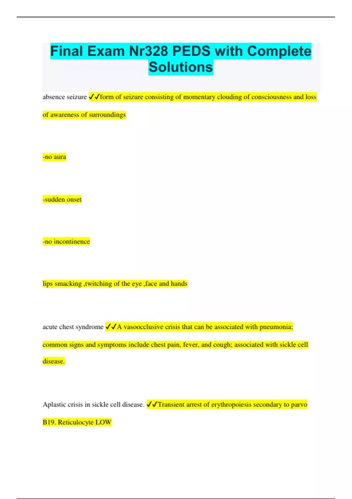 Final Exam Nr328 PEDS with Complete Solutions absence seizure form of seizure consisting of momentary clouding of consciousness and loss of awareness of surroundings -no aura -sudden onset -no incontinence lips smacking ,twitching of the eye ,face and hands acute chest syndrome A vasoocclusive crisis that can be associated with pneumonia; common signs and symptoms include chest pain, fever, and cough; associated with sickle cell disease. Aplastic crisis in sickle cell disease. Transient arrest of erythropoiesis secondary to parvo B19. Reticulocyte LOW Low Hgb, increased leukocytes. Functional systolic murmur due to hyperdynamic blood flow appropriate injection site infants :Vastus lateralis muscle toddler : deltoid Associated conditions with Diabetes 2 Polycystic ovary syndrome (PCOS)-OVERWEIGHT Acanthosis nigricans -(black neck)-darker pigmentation in skin folds, like neck or arm pit. At what age does a cleft lip repair occur? 2-3 months old At what age does a cleft pallet repair occur? 6-12 months atonic seizure Sudden decrease in muscle tone - loss of postural control - patient may fall ("drop attack") Autism a mental condition, present from early childhood, characterized by difficulty in communicating and forming relationships