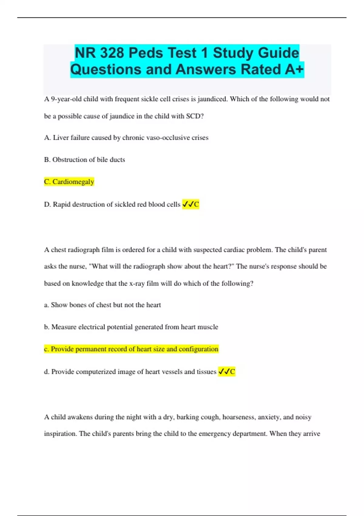 NR 328 Peds Test 1 Study Guide Questions and Answers Rated A+ A 9-year-old child with frequent sickle cell crises is jaundiced. Which of the following would not be a possible cause of jaundice in the child with SCD? A. Liver failure caused by chronic vaso-occlusive crises B. Obstruction of bile ducts C. Cardiomegaly D. Rapid destruction of sickled red blood cells C A chest radiograph film is ordered for a child with suspected cardiac problem. The child's parent asks the nurse, "What will the radiograph show about the heart?" The nurse's response should be based on knowledge that the x-ray film will do which of the following? a. Show bones of chest but not the heart b. Measure electrical potential generated from heart muscle c. Provide permanent record of heart size and configuration d. Provide computerized image of heart vessels and tissues C A child awakens during the night with a dry, barking cough, hoarseness, anxiety, and noisy inspiration. The child's parents bring the child to the emergency department. When they arrive the child's symptoms have subsided. Which of the following home care instructions can the ED nurse provide to the family regarding future episodes the child may experience? a. Provide oxygen therapy using a nasal cannula b. Expose the child to mist by running a hot shower c. Treat the child with antipyretics d. Treat the child with antibiotics B A child experiencing an acute asthma attack presents to the emergency department. Which of the following medications should a nurse prepare to administer to the child as an interventions for an acute asthma attack? a. Terbutaline (Brethine) b. Beclomethasone dipropionate (QVAR) c. Prednisone (Deltasone) d. Albuterol (Proventil) D A child with asthma is having pulmonary function tests. Which of the following explains the purpose of the peak expiratory flow rate (PEFR)? a. Confirms the diagnosis of asthma b. Determines the cause of asthma c. Identifies the "triggers" of asthma d. Assesses the severity of asthma D